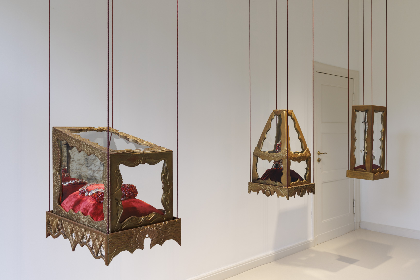The group show interacts with Pélassy’s work at various points. The exhibition architecture by Japanese artist Soshiro Matsubara, consisting of labyrinthine fixtures, wall hangings, mirrors, carpets, and a wide variety of Mannerist ceramics and lamps, forms the basis for this exchange. The urgency and relevance of Pélassy’s inquiries in relation to contemporary concerns become apparent through the direct juxtaposition of and interaction between each of the works in the exhibition spaces. In dialogue with Pélassy, the group presentation reflects on the malleability of the body, its transitoriness, as well as on a failing political system in which illness has come to be read as an indicator of social power relations.