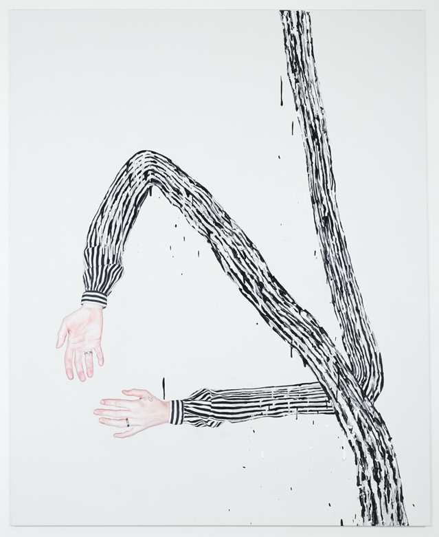 In her bold works, the artist focusses on naturalistically painted hands, as well as sometimes feet, on white backgrounds. These are executed in diverse and dynamic ways; sometimes Douglas dissolves the limbs into loose, abstract brushstrokes from the wrists or ankles onwards, turning them into pure and simultaneously graphic painting which is in part reminiscent of Impressionist brushwork in terms of style or borrows from Abstract Expressionist techniques. Douglas combines representational and abstract painting by creating novel transitions from one to the next. The body may be lacking in these constellations, but is nevertheless conjured up by the reduced brushstrokes and the dynamic shape of the extremities, as a fragmented yet elastic anatomy. The artist’s hands have been closely linked to creative work throughout art history. In Douglas’ work the creative hands virtually dance around the absent body at the end of grotesquely long arms. Despite the paintings containing no clear references to other artists or explicitly contemporary themes, the hands seem to reference our current living reality, in which a connection to the digital world is made via the hands. Here, the body recedes while the hands explore ever new worlds through the keyboards and screens of digital interfaces. Sometimes multiple hands in Douglas’ paintings create an entire network; they interact with and amongst themselves, creating a reflection of the immaterial connection via digital channels on her canvasses.