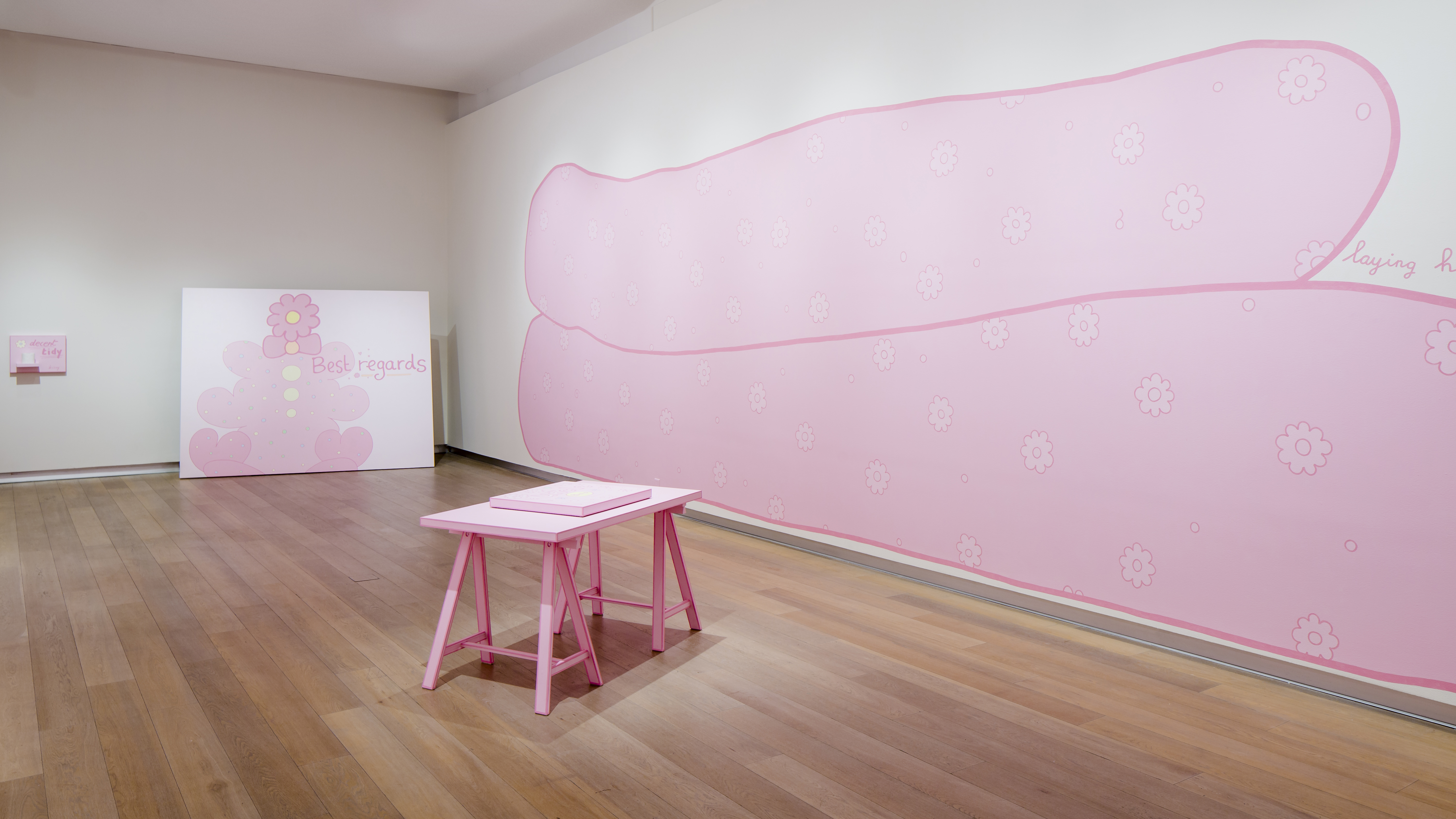 Suggestions of the body are found in cartoonish forms; two large wall paintings pair short sayings like “nice being here on the left side,” “nice being here on the right side” or “laying here together” with lumpy anthropomorphic twosomes. While these wall paintings tower over viewers, they are inviting and pleasant. Their limp bodies are adorned in floral elements and painted in the style of a doodle, evoking friendly cartoon giants. Text in other sculptures and paintings is similarly affable, innocuous or passive, like "Best Regards" or the exhibition’s namesake "Huh."