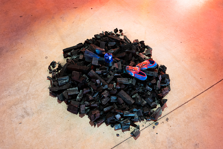 For this first large-scale project in a cultural venue, Mégane Brauer chose to open up a new dimension in her work and extend her invitation to five young teenage exiles, with whom she forms an artistic collective and shares a common story around fire. The result is a vast, immersive and poetic environment made up of dozens of cypress trees that seem to burst into flames, and glittering coal. Designed to match the building and its architecture, which itself appears to be ablaze, it is the setting for texts, echoing objects, sound works and an invitation to take part in the project.
