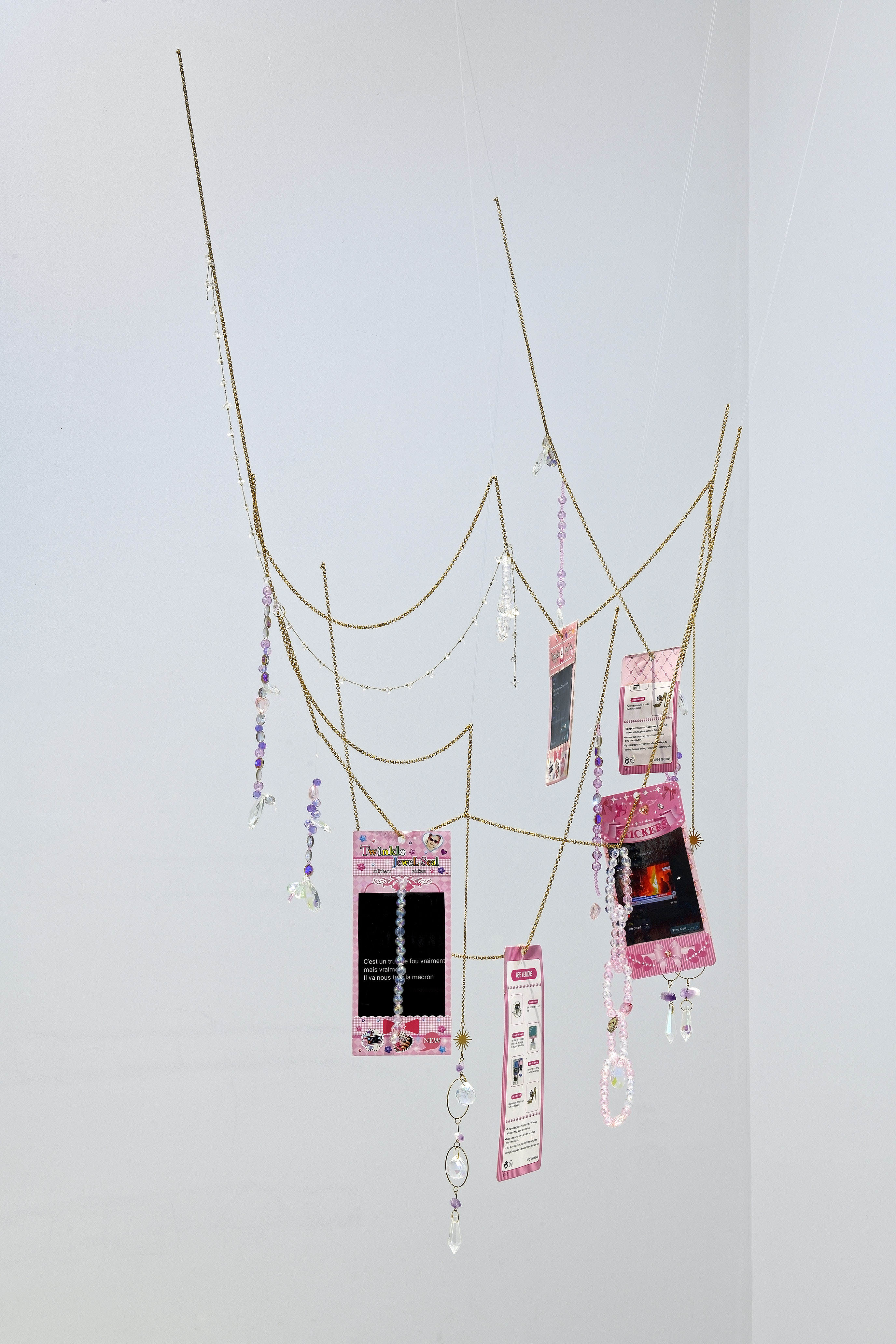 2023 Printed text on wall-mounted A4 sheet with gold chains, tassels, suncatcher, laminated text, fishing line, cardboard, rhinestones Variable dimensions |