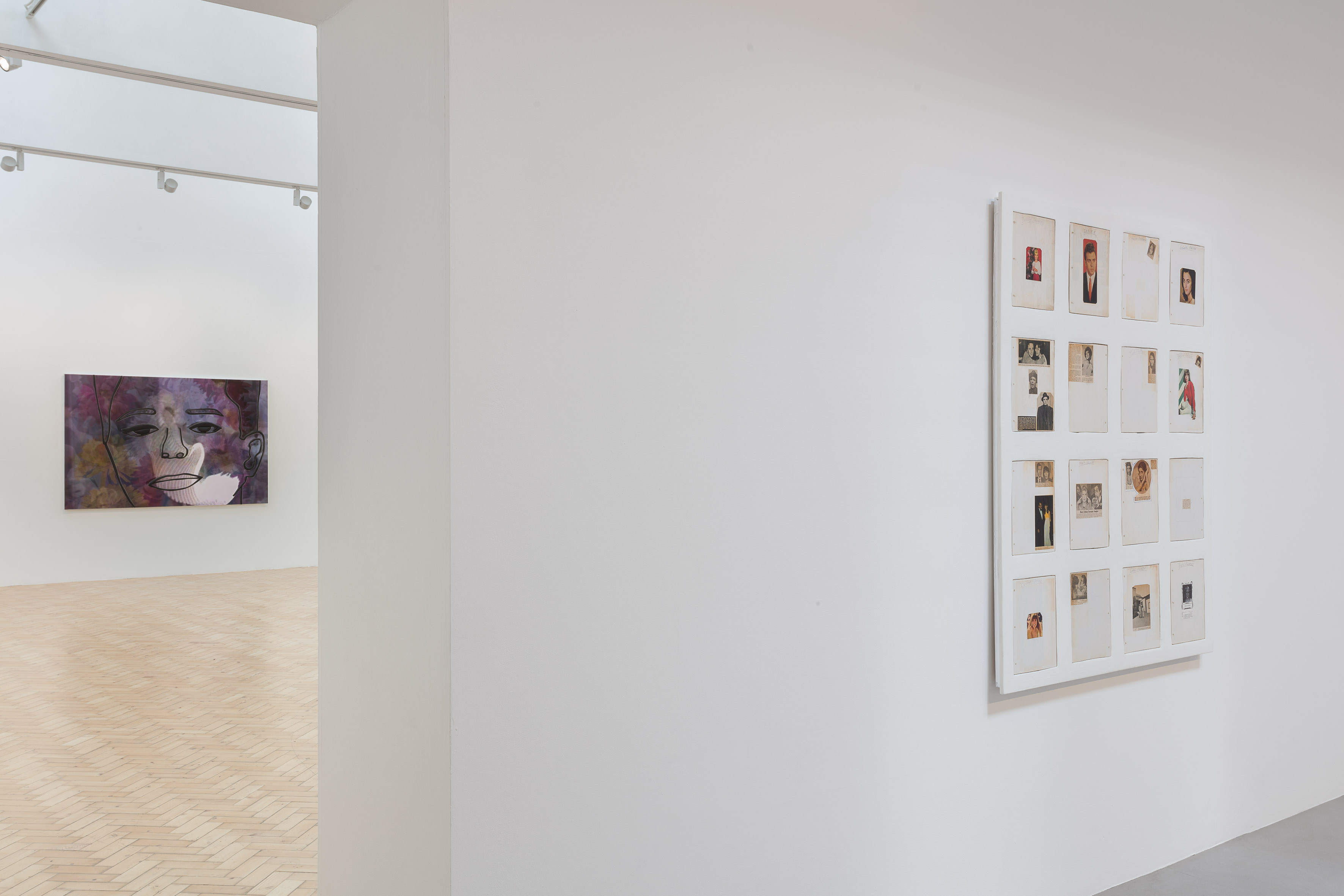 In Hotel Fashion, an aqua-resin painting of pixelated looking loops of colour falls into darkness, like the final effects of a computer that is about to die. The piece is embedded with a photo of patterned velvet and an image of the hotel room Janis Joplin died in that has been digitally altered, red spilling over the shadowy image. The interplay between night and day figures heavily in these larger scale works, implying a subtle critique of time as we understand it – a sense that the present moment is in fact made up of fragments of all kinds of time: what we carry inside us from our own past and the collective past of other people. In Tree Mall, an aqua-resin painting of a tree with a white trunk is set against a daytime image of a mall in the ’50s. In Parking Lot, a contemporary video still of street racers at night is split in half by a towering aqua-resin painting of a purple-headed tulip. The flower has the stature and aura of a person making a silent speech – someone transcending corporate spaces for their own uses. This affection for the individual carries into F, a tender work comprised of pages from an unknown person’s scrapbook of celebrity clippings from the ’50s and ’60s, arranged alphabetically, each with a last name beginning with “F”. The pages themselves are arranged sparingly, with a varying logic to the layout of their subjects, many of whom were lesser known, including obscure background actors and an obituary for Bess Flowers, an extra who “never had her name known”. The yellowed pages are embedded in white painted aqua-resin and arranged in rows of four – Benning leaving their own measure of blank space between the actors. This same technique is employed in Cats, a grid of 46 intensely personal photographs of cats and kittens lounging and playing in the tawny light of an apartment sometime in the ’60s, all set against painted black aqua-resin. It is clear that the rooms of this apartment resemble the minds that inhabited them – ones we come to know intimately through their obsessive documenting, despite never seeing their faces.