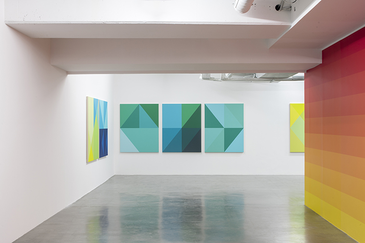 Created on a computer to begin with and then transposed to a canvas or wall, Stéphane Dafflon’s pictorial work is always designed with a specific place or architecture in mind. It is incorporated within his work and his actions change the audience’s perception of it, visually and physically. The long chromatic variation of shades displayed in Stéphane Dafflon’s wall installation brings an impression of movement to the different areas at le plateau and feelings experienced by visitors reflect a certain affinity with the world of music.