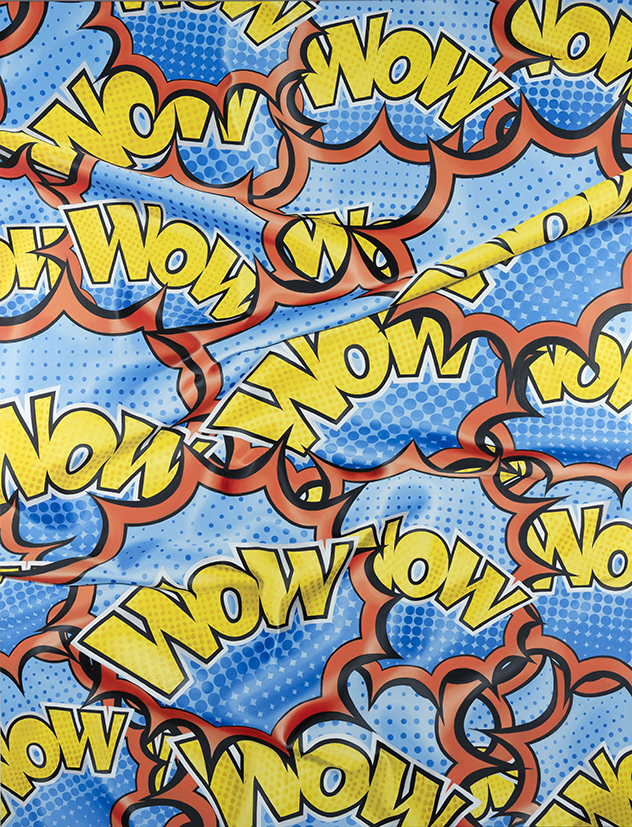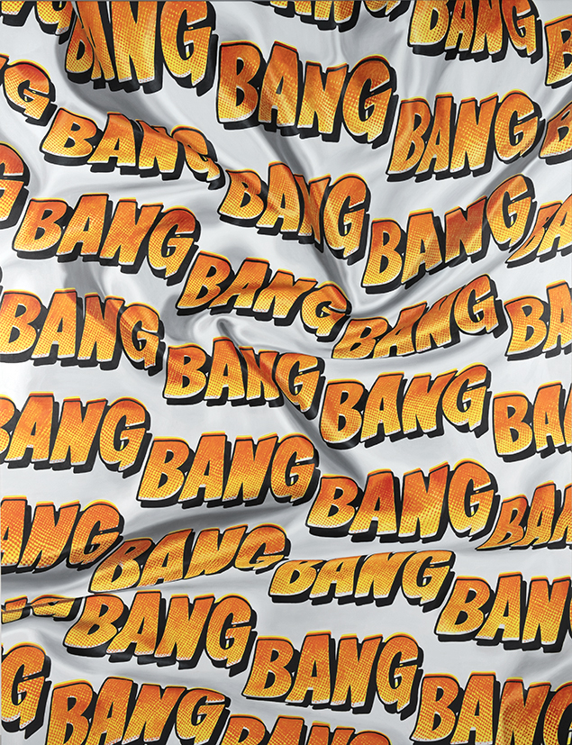Eliza Douglas présente quatre nouvelles toiles en trompe-l’œil froissées ou distordues. Chacune d’elles scandent une onomatopée, un rythme bruitiste SHHHH, WOW, BOOM, HAHAHA et traduisent des émotions fortuites : une exclamation, une admiration, une stupéfaction, un agacement ou un rire inopportun. Elles sont installées en lévitation, le message de l’une renvoyant à l’autre comme des liens hypertextes. Elles pourraient être aussi la réponse d’une Joke Painting de Richard Prince, une version hyperpop de Incantation by Laughter (1910) de Velimer Khlebnikov ou du Hurra, Hurra, Hurra (1921) de Raoul Hausmann. Cliquer sur les pièces d’Eliza Douglas, c’est encore dériver sur les répétitions de Sturtevant, elles-mêmes renvoyant aux motifs de fleurs répétés d’Andy Warhol. Elles sont des images d’images, des peintures automatiques générant des émotions ataviques et standardisées. Sa procédure consiste à cristalliser des sentiments incontrôlés, à formaliser ce qui préexiste à la parole, à signifier –à la manière de la poésie concrète- des énoncés a priori impropres à nommer.
