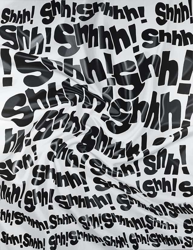 Eliza Douglas is presenting four new trompe-l’œil — crumpled or distorted — paintings. Each one of them utters an onomatopoeia, a foley rhythm — SHHHH,