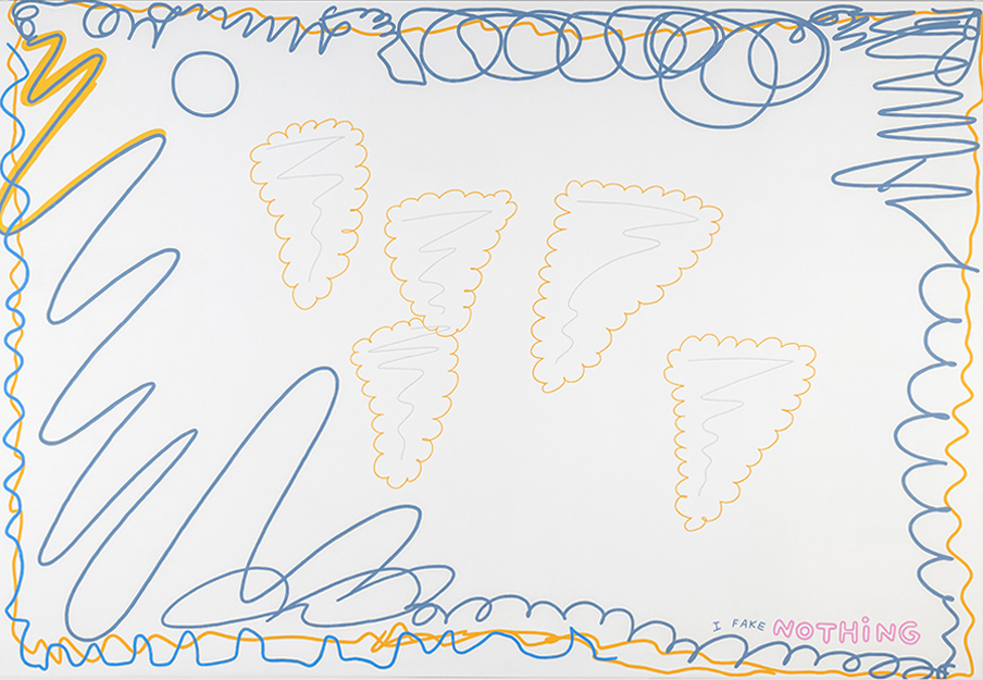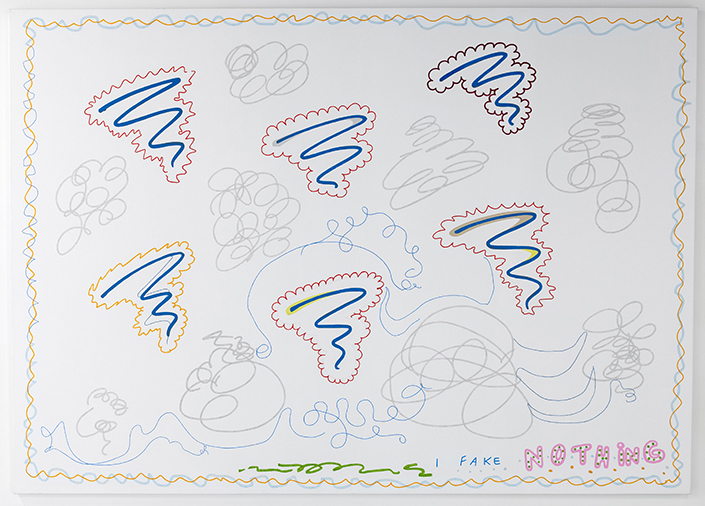 Ses bulles ou lacaneries pulp sont face au papier peint achetable sur commande de Lily van der Stokker, reproduisant une guirlande de pilules rosées, des motifs abstraits pastel comme une pochette d’album d’easy-listening aux vertus joyeuses et sédatives. L’artiste s’est fait une spécialité d’une forme mignonne et low key marquée par l’expression d’une candeur existentielle. Dans cet esprit, I fake Nothing est une série de dessins sur le rien bien que l’art qui prétend n’être sur le rien ne l’est jamais… Les spectateurs sont parfois trop obéissants aux énoncés d’une œuvre. Les motifs enfantins, nuages acidulés, guzzi-guzzi répondent par chuchotement au style brutal de ses consœurs de la post-picture generation que sont Barbara Kruger et Jenny Holzer. Ses couleurs layettes ou sablées minaudent les prétentions modernistes, « loufoquisent » les ambitions d’un art voué au grands desseins et transformations. Ses comptines graphiques sont adorables avec tout que cela suppose d’ambivalence entre compliment et condescendance. Le cute est toujours ici entre l’agression et la tendresse.