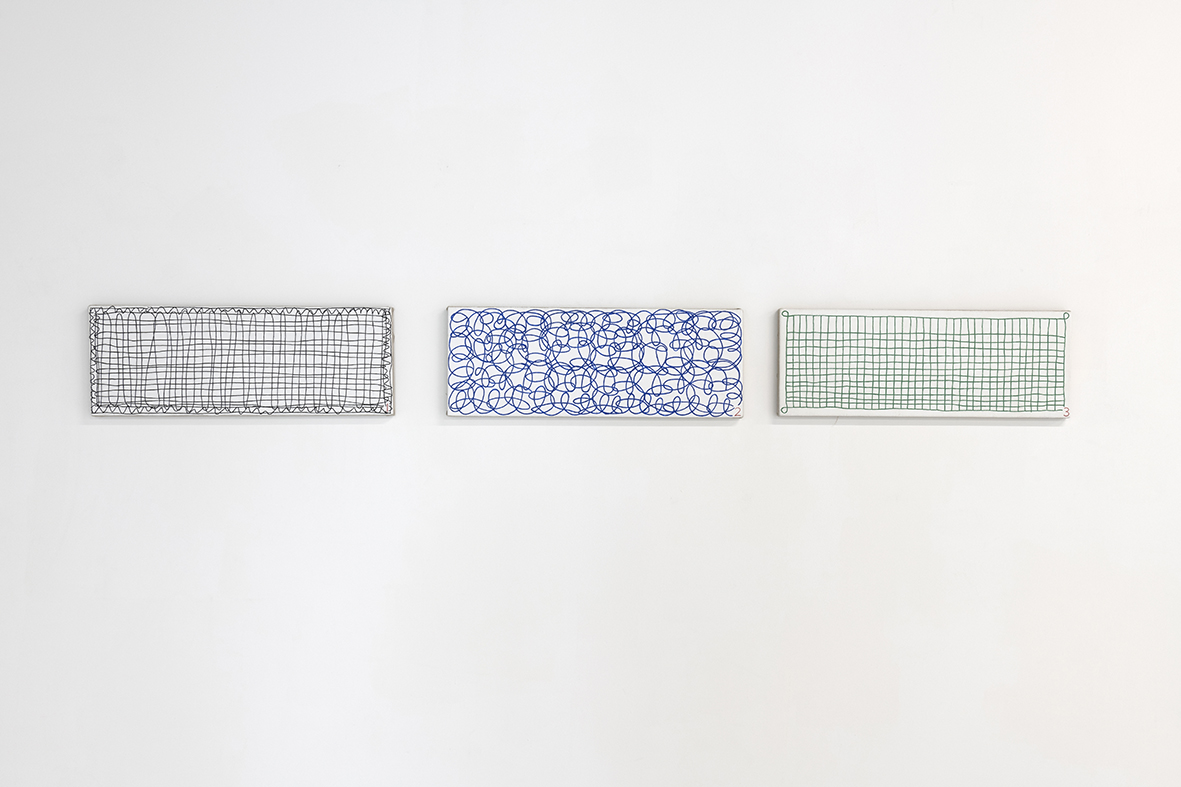 Lily van der Stokker, Abstract 1 2 3, 1988. Triptych, acrylic paint on linen, each: 20 x 60 cm. Unique. Photo Marc Domage.