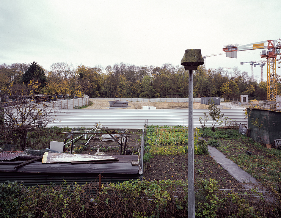 Les jardiniers ont gagné en justice et obtenu l'arrêt des travaux d'extension de la piscine d'entraînement pour les Jeux Olympiques de Paris 2024, mais les jardins ont été détruits et pour le moment ne reste qu'un large trou entouré de palissades, Jardins ouvriers des Vertus, Aubervilliers, 27 novembre 2022