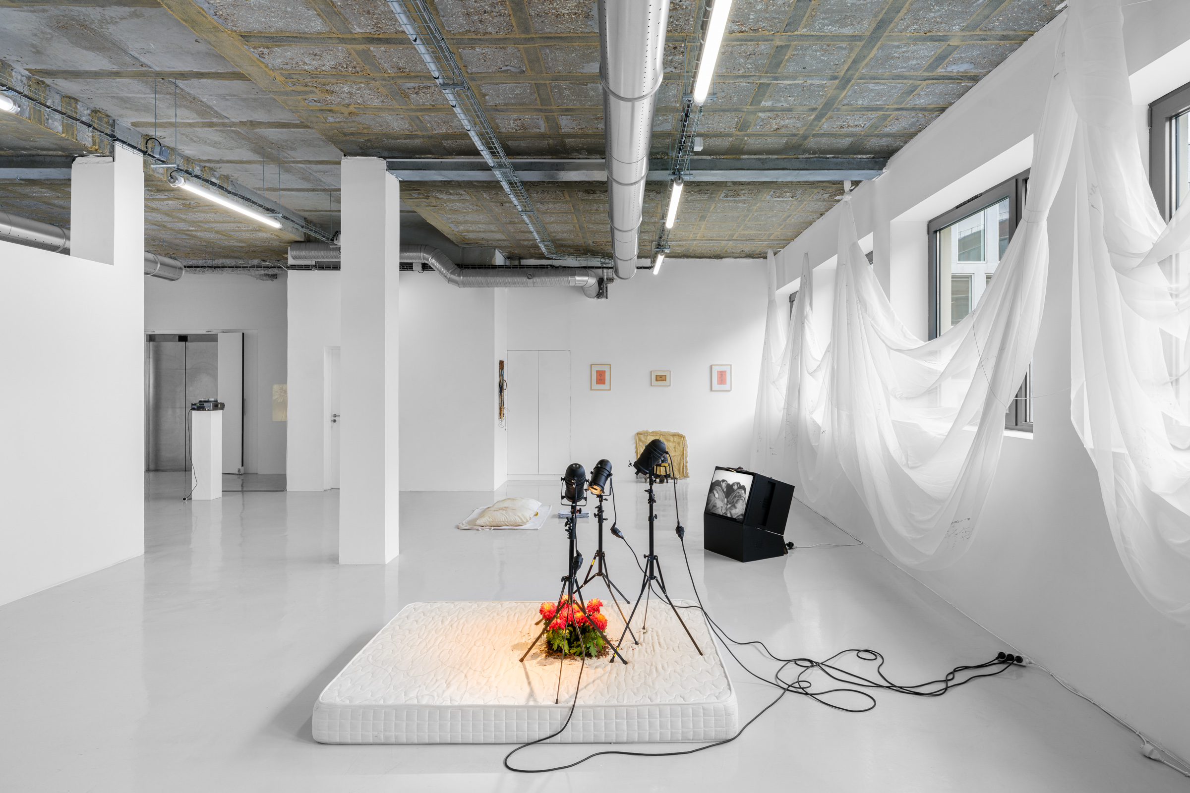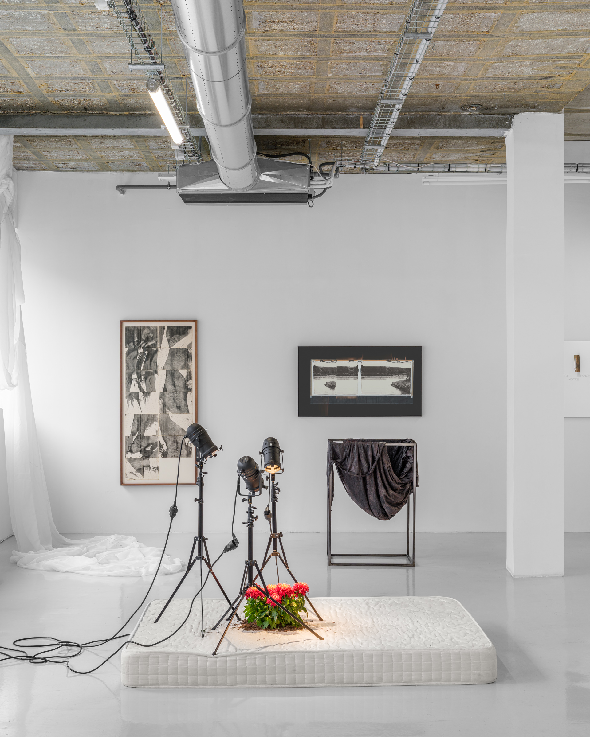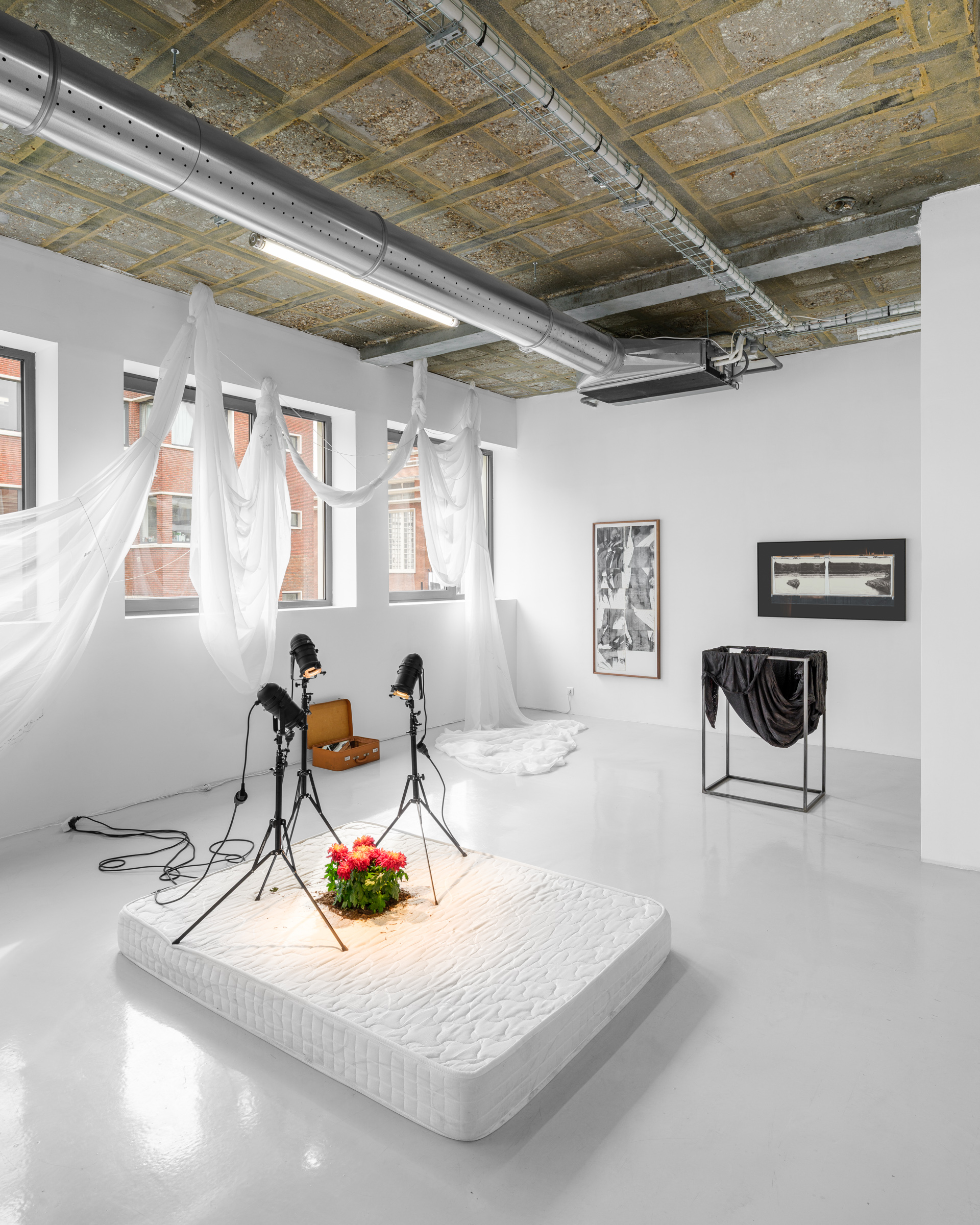, 2020. Double mattress, bouquet of chrysanthemums, spotlights. Variable dimensions. Photo : Grégory Copitet.