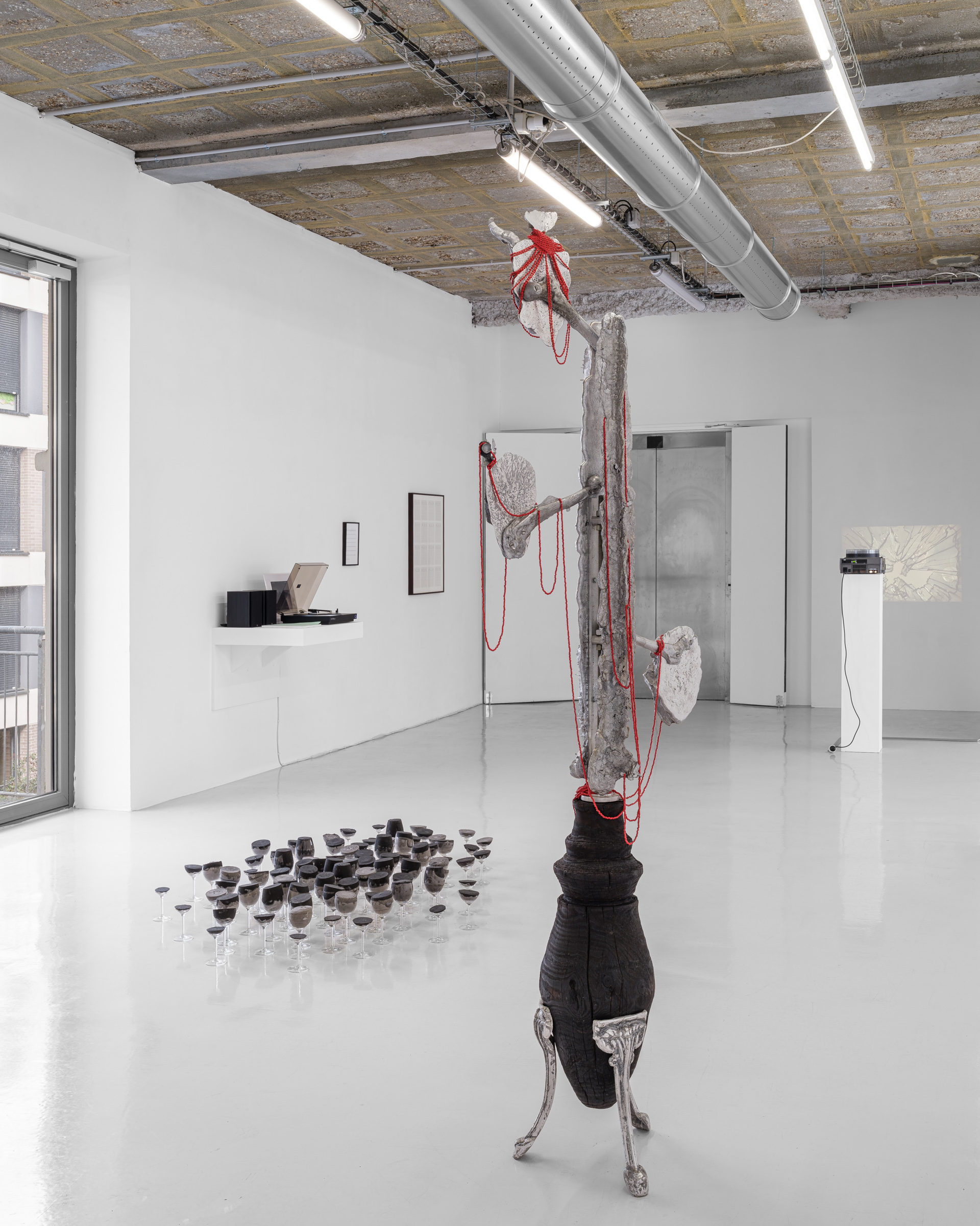 Nicolas Aguirre, Phantom columns N1, 2023-2026. Cast aluminum, wooden basin, spondylus necklaces. 200 x 50 x 50 cm. Photo : Grégory Copitet.