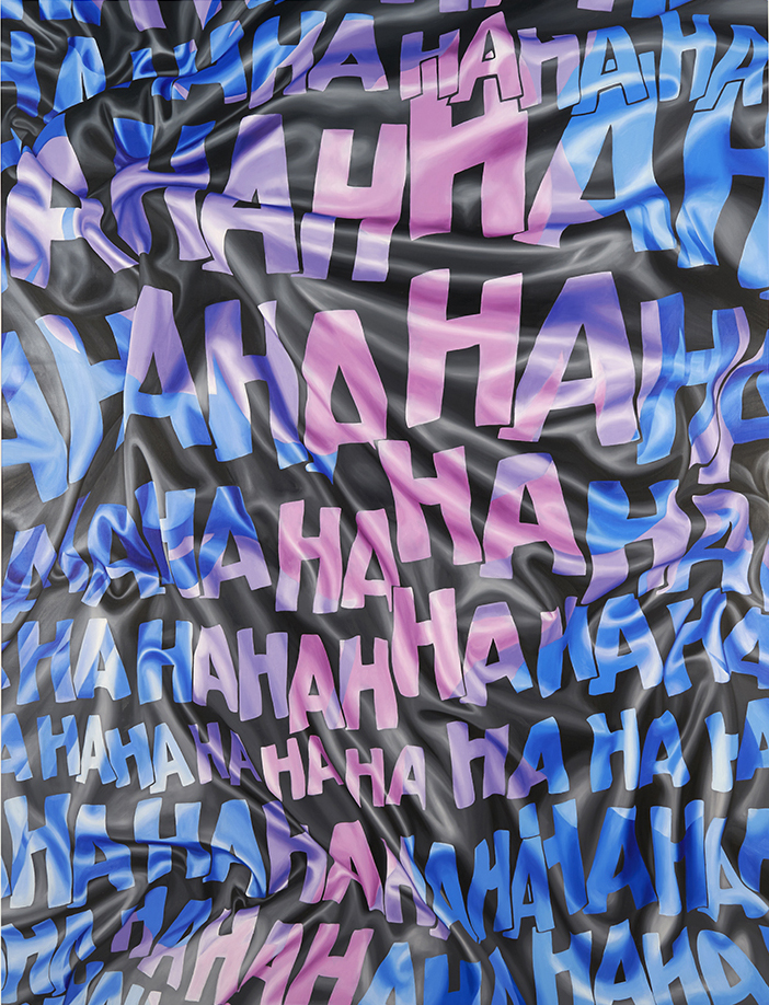 Eliza Douglas présente quatre nouvelles toiles en trompe-l’œil froissées ou distordues. Chacune d’elles scandent une onomatopée, un rythme bruitiste SHHHH, WOW, BOOM, HAHAHA et traduisent des émotions fortuites : une exclamation, une admiration, une stupéfaction, un agacement ou un rire inopportun. Elles sont installées en lévitation, le message de l’une renvoyant à l’autre comme des liens hypertextes. Elles pourraient être aussi la réponse d’une Joke Painting de Richard Prince, une version hyperpop de Incantation by Laughter (1910) de Velimer Khlebnikov ou du Hurra, Hurra, Hurra (1921) de Raoul Hausmann. Cliquer sur les pièces d’Eliza Douglas, c’est encore dériver sur les répétitions de Sturtevant, elles-mêmes renvoyant aux motifs de fleurs répétés d’Andy Warhol. Elles sont des images d’images, des peintures automatiques générant des émotions ataviques et standardisées. Sa procédure consiste à cristalliser des sentiments incontrôlés, à formaliser ce qui préexiste à la parole, à signifier –à la manière de la poésie concrète- des énoncés a priori impropres à nommer.