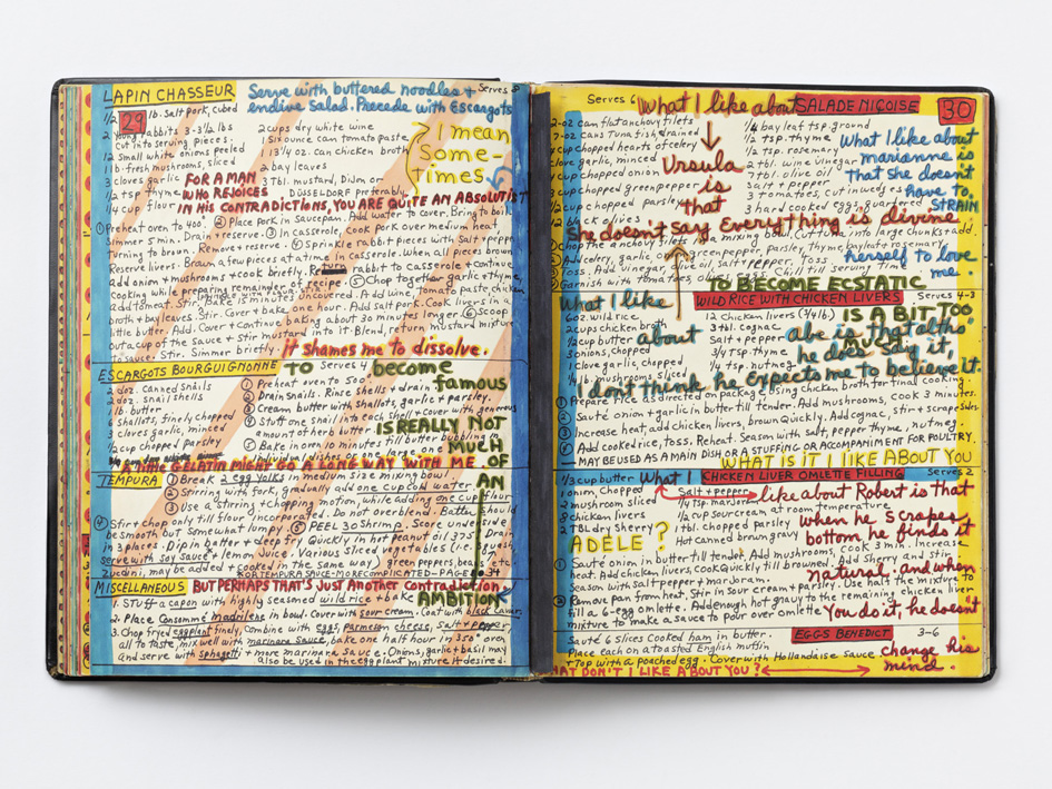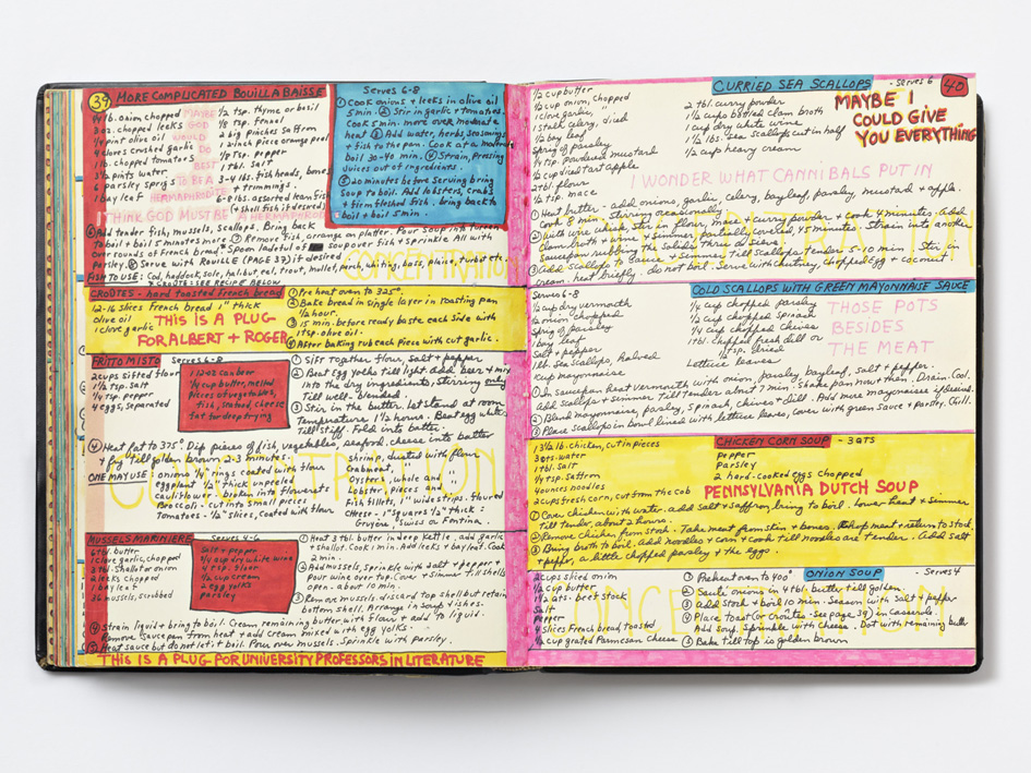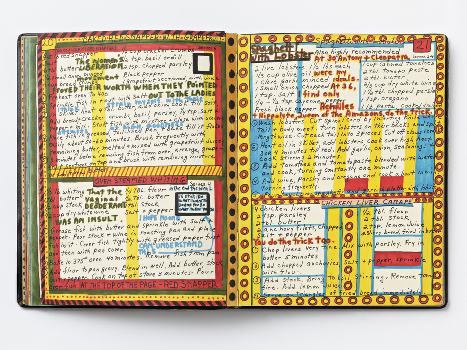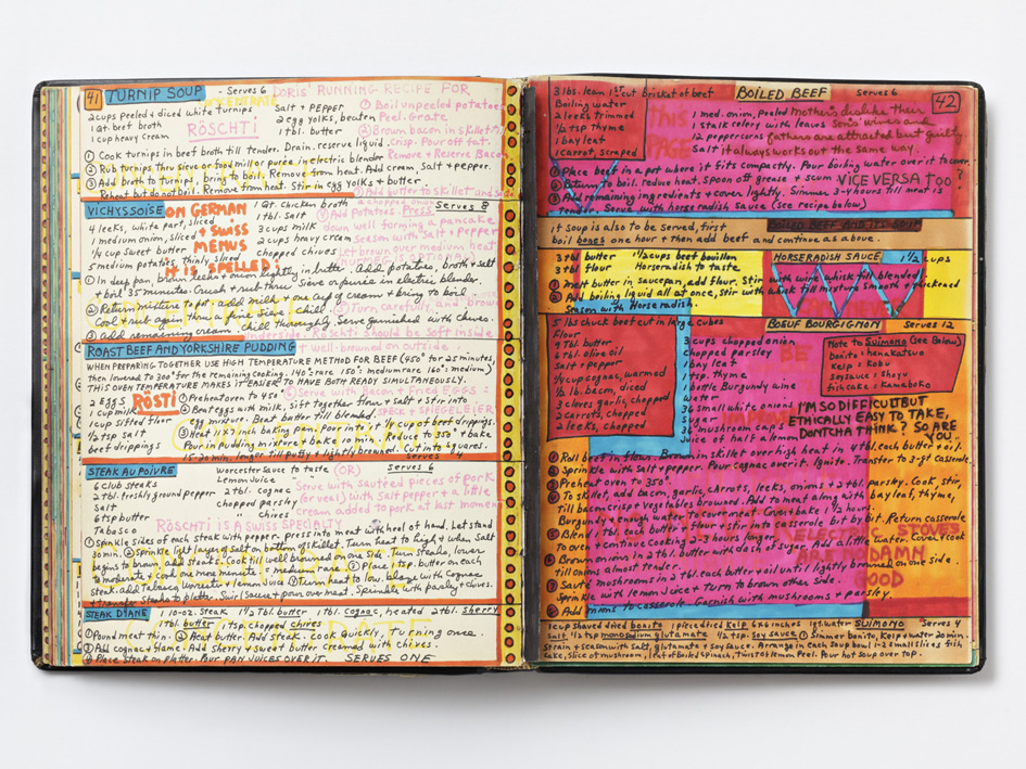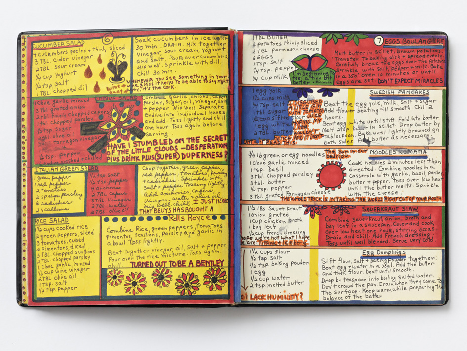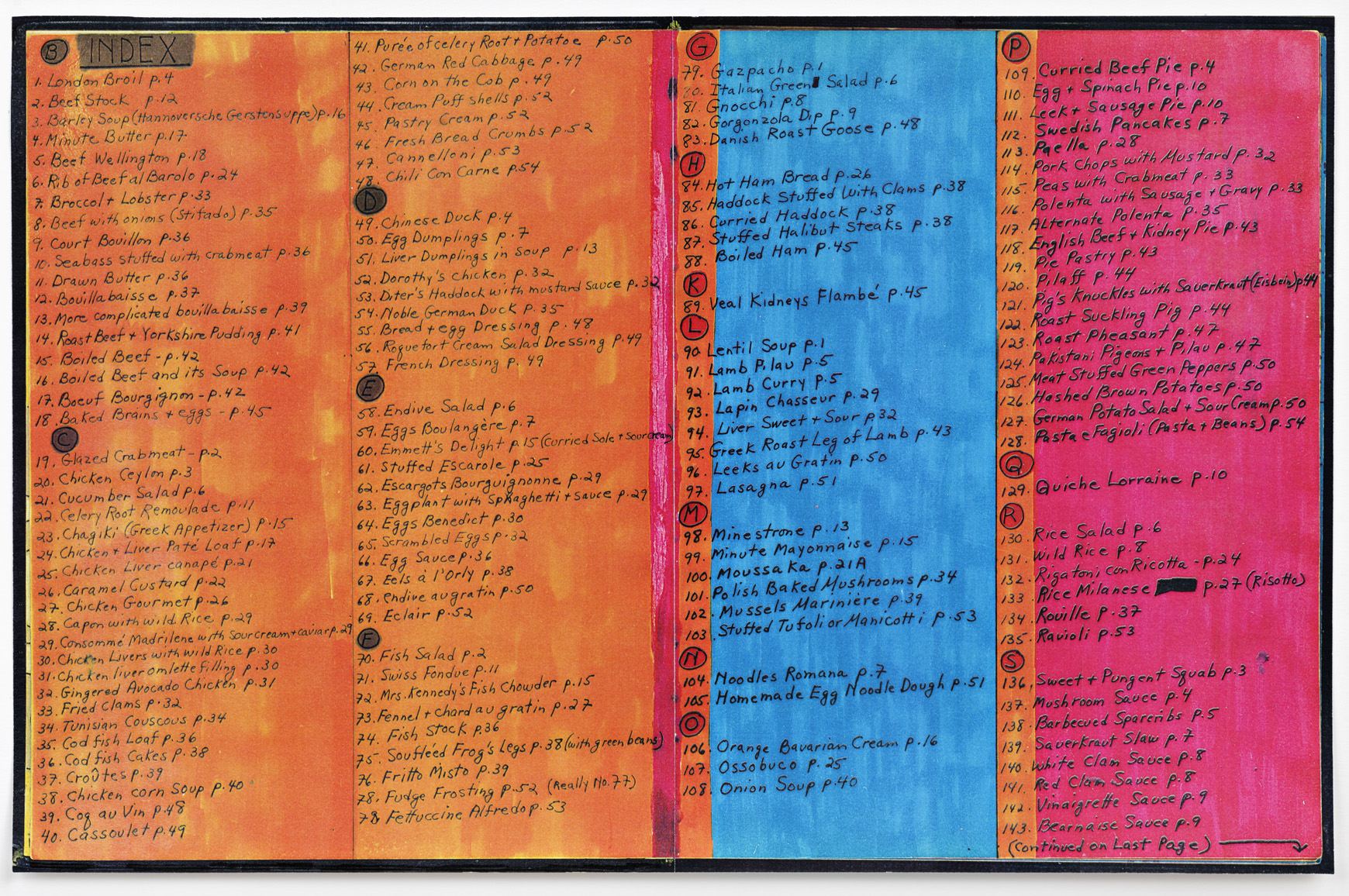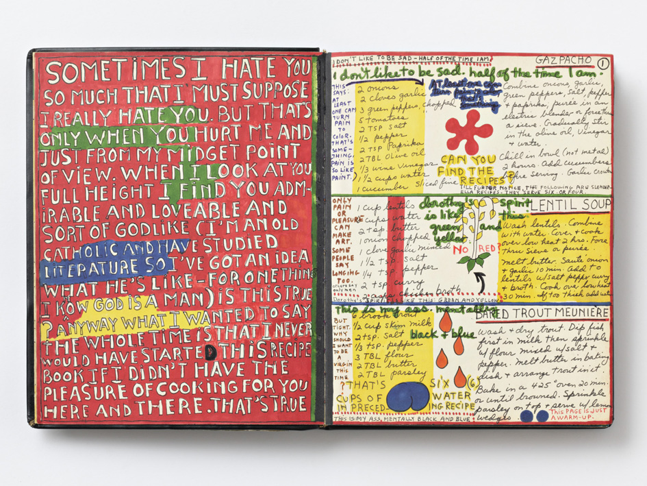 A Cookbook1969Artist book, felt pen on Bristol board, 62 pages and cover. 30 x 24 cm. Created in 1969, when she was living with Swiss artist Dieter Roth, the Cookbook is a perfect example of how she mixes daily life and an existential approach, culminating in her vision of cooking as an outlet for both eroticism and introspection. A real book of recipes full of visual delights, the Cookbook contains densely decorated pages with patterned designs, packed text, and vibrant colors. Personal sentences are interspersed among the lists of ingredients, revealing the exultations and tribulations of her life between the lines of recipes. Filled with wit and wordplay, associations between aliments and idiosyncratic thoughts—“At least one can turn pain to color” accompanies the recipe for gazpacho; “Dorothy's spirit is like this: green and yellow,” is written next to the ingredients for lentil soup—the Cookbook constitutes a mundane but essential self-portrait of the artist as a cook and a lover. |