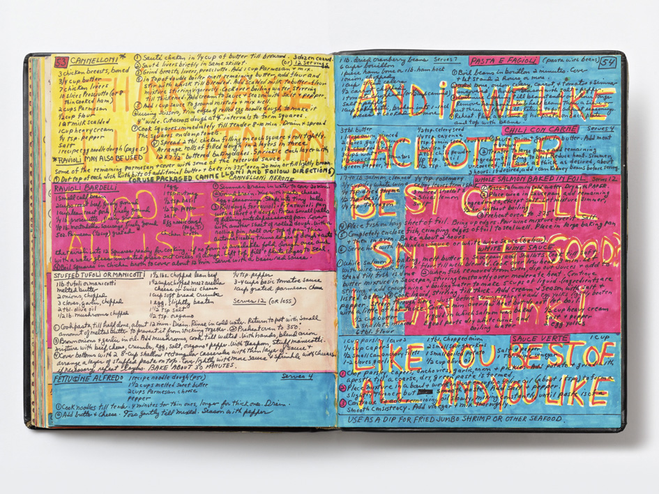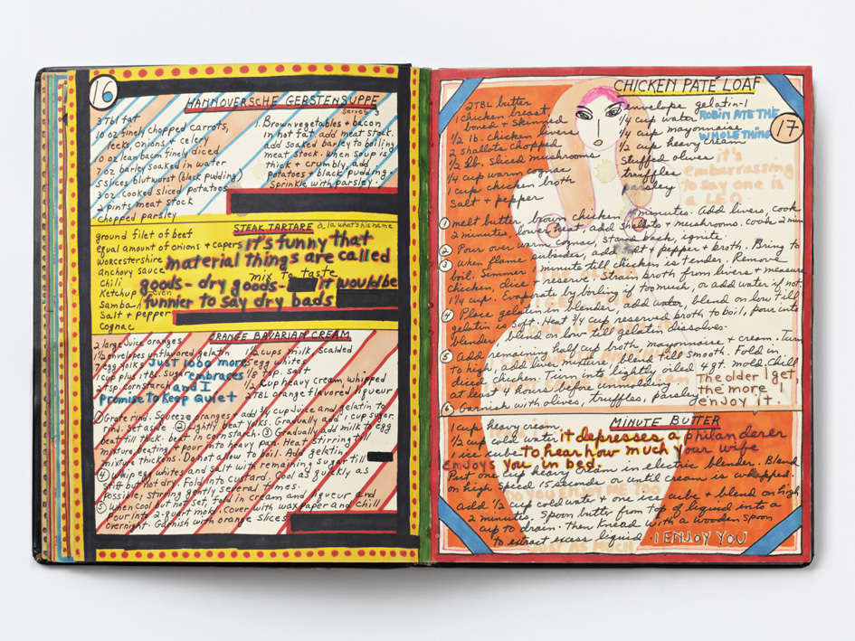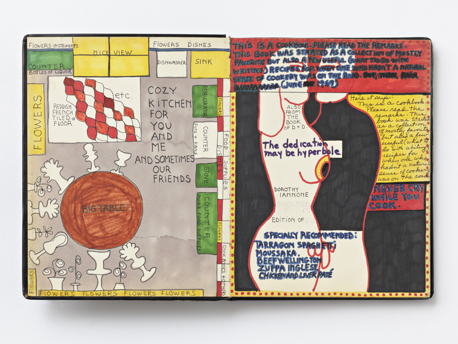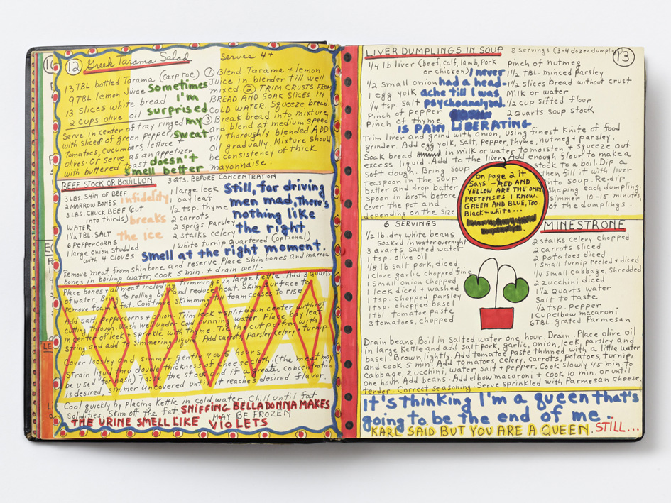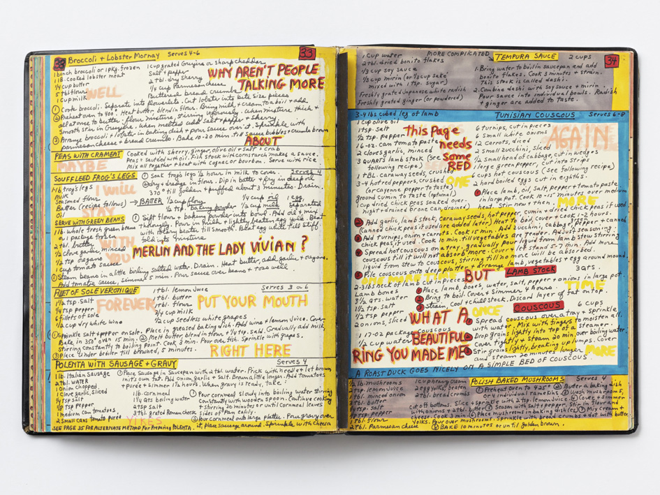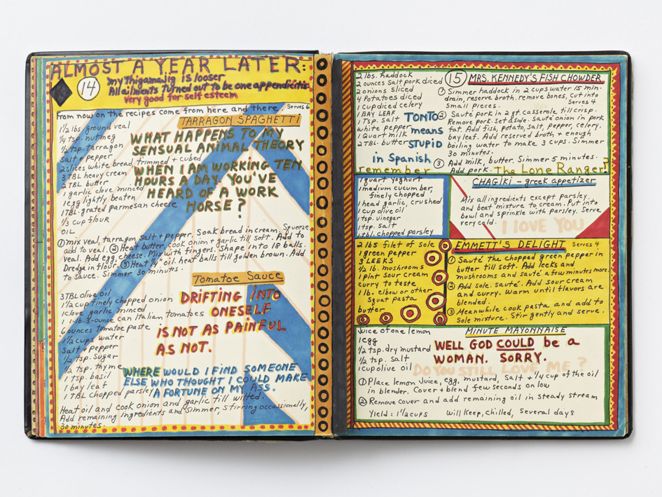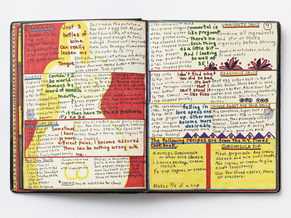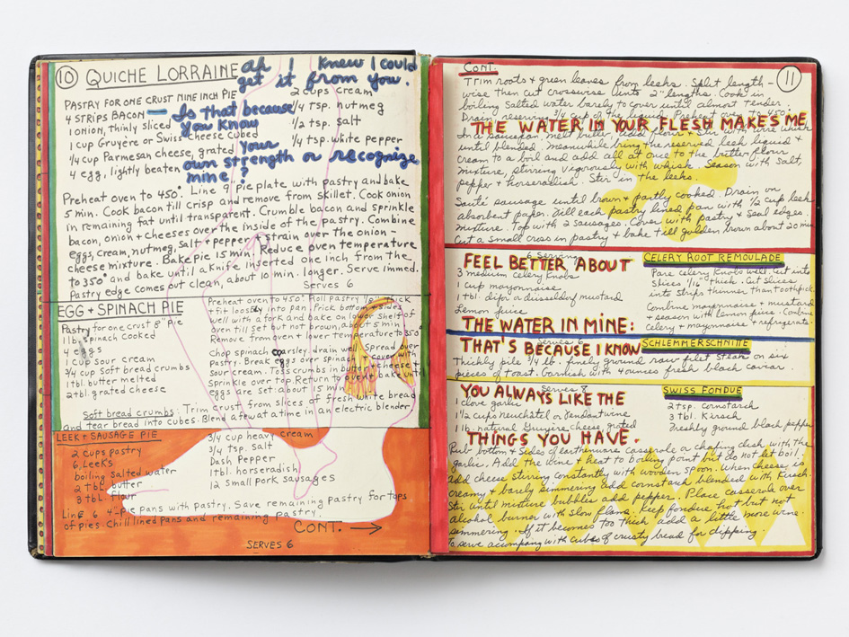 A Cookbook1969Artist book, felt pen on Bristol board, 62 pages and cover. 30 x 24 cm. Created in 1969, when she was living with Swiss artist Dieter Roth, the Cookbook is a perfect example of how she mixes daily life and an existential approach, culminating in her vision of cooking as an outlet for both eroticism and introspection. A real book of recipes full of visual delights, the Cookbook contains densely decorated pages with patterned designs, packed text, and vibrant colors. Personal sentences are interspersed among the lists of ingredients, revealing the exultations and tribulations of her life between the lines of recipes. Filled with wit and wordplay, associations between aliments and idiosyncratic thoughts—“At least one can turn pain to color” accompanies the recipe for gazpacho; “Dorothy's spirit is like this: green and yellow,” is written next to the ingredients for lentil soup—the Cookbook constitutes a mundane but essential self-portrait of the artist as a cook and a lover. |