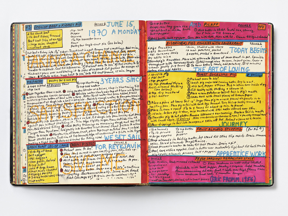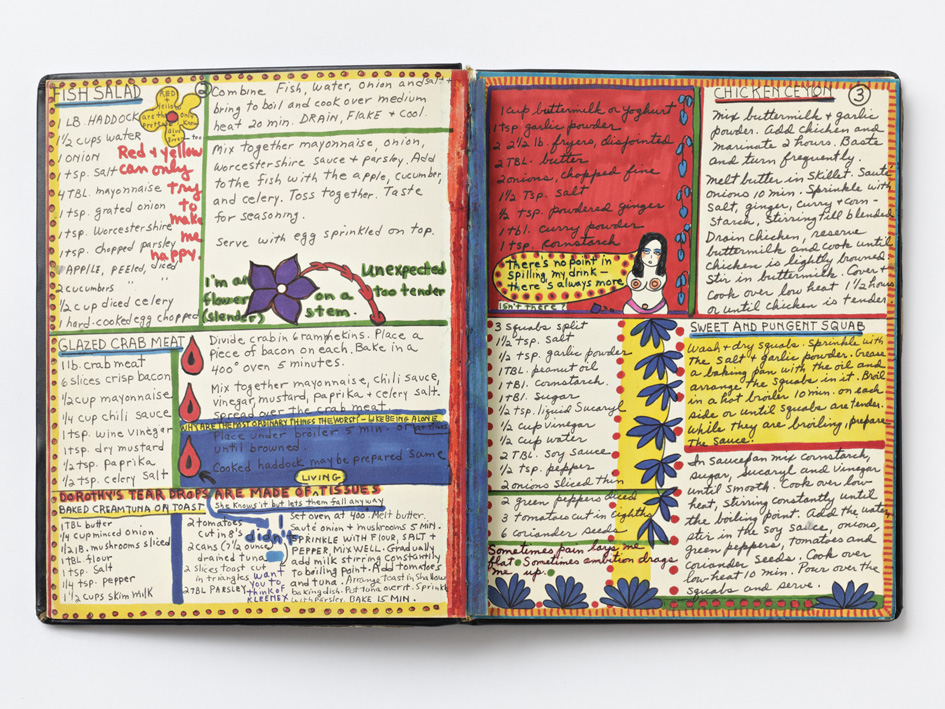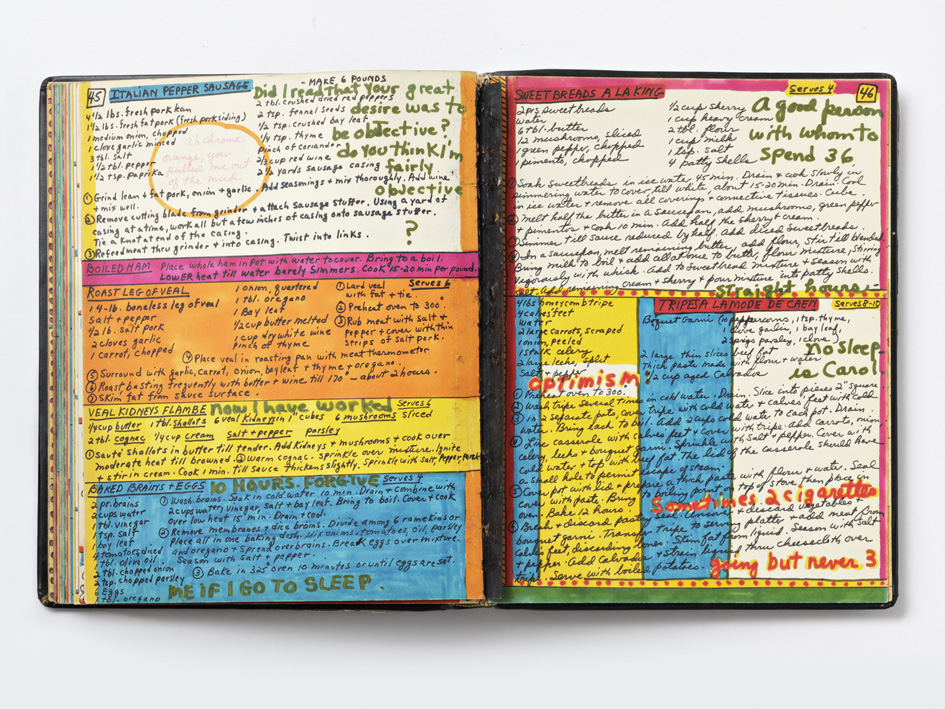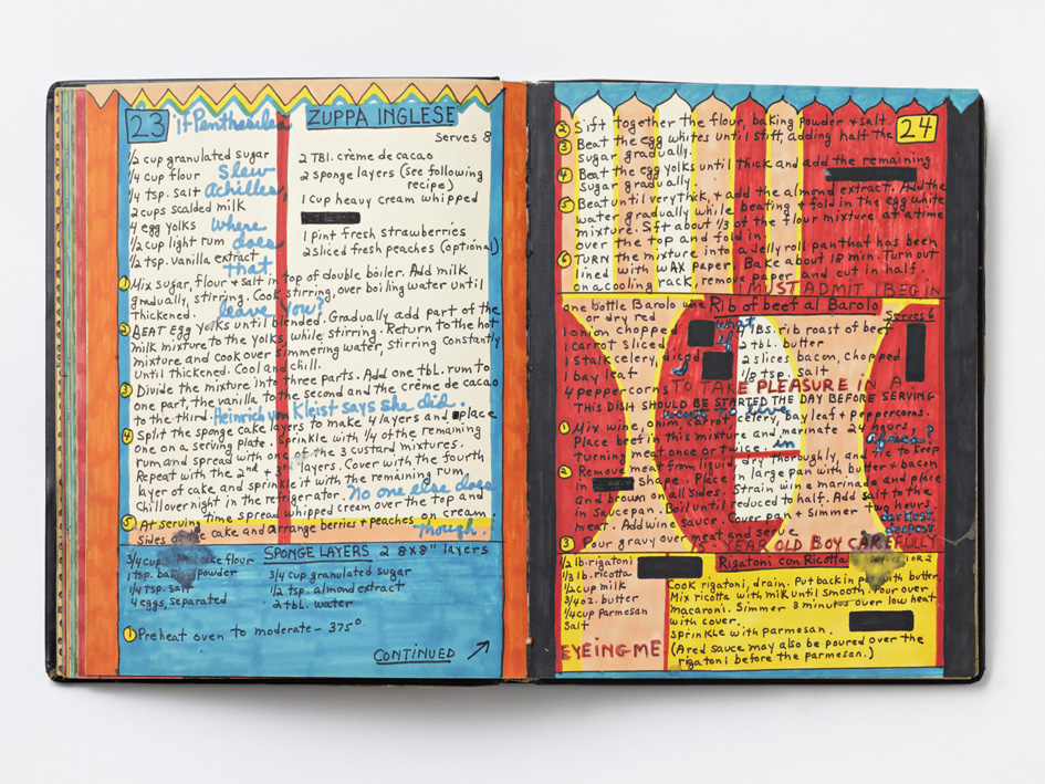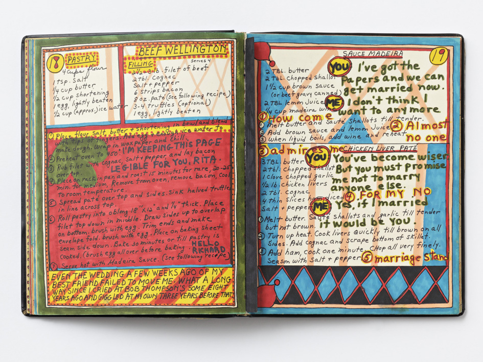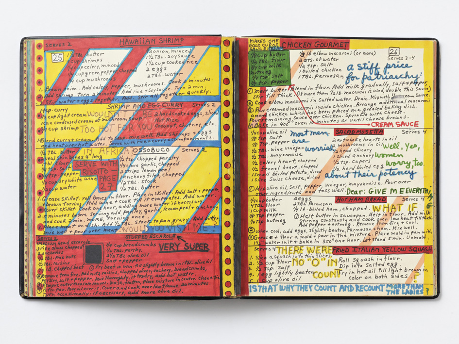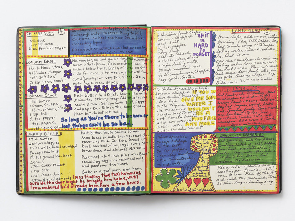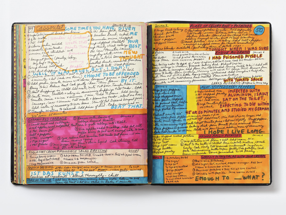 A Cookbook1969Artist book, felt pen on Bristol board, 62 pages and cover. 30 x 24 cm. Created in 1969, when she was living with Swiss artist Dieter Roth, the Cookbook is a perfect example of how she mixes daily life and an existential approach, culminating in her vision of cooking as an outlet for both eroticism and introspection. A real book of recipes full of visual delights, the Cookbook contains densely decorated pages with patterned designs, packed text, and vibrant colors. Personal sentences are interspersed among the lists of ingredients, revealing the exultations and tribulations of her life between the lines of recipes. Filled with wit and wordplay, associations between aliments and idiosyncratic thoughts—“At least one can turn pain to color” accompanies the recipe for gazpacho; “Dorothy's spirit is like this: green and yellow,” is written next to the ingredients for lentil soup—the Cookbook constitutes a mundane but essential self-portrait of the artist as a cook and a lover. |