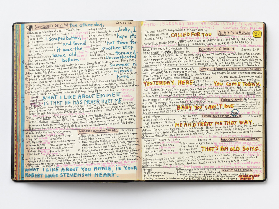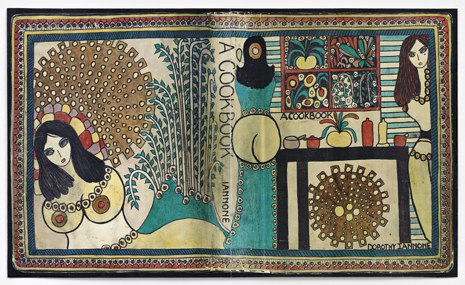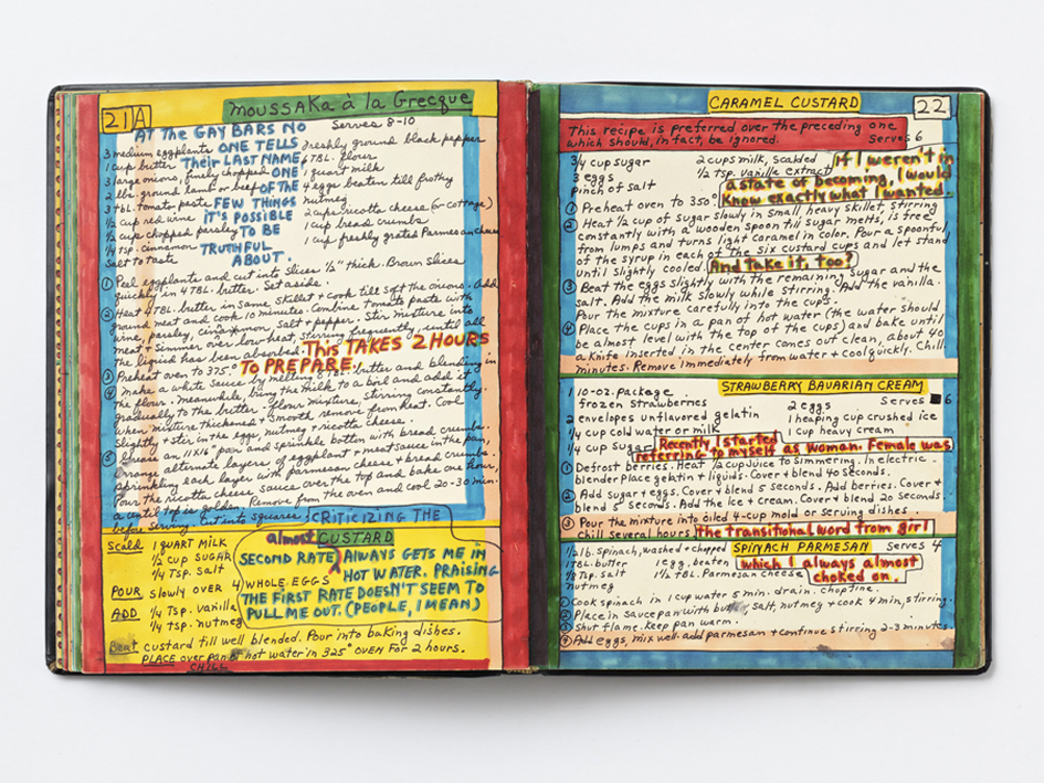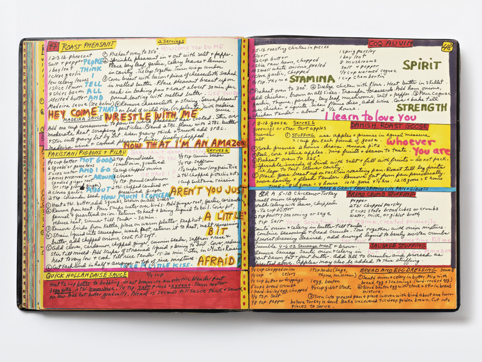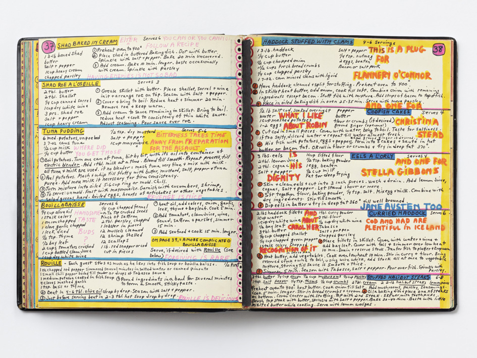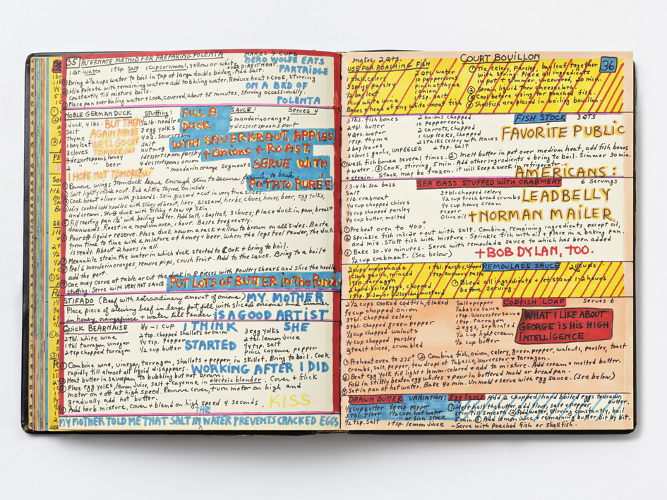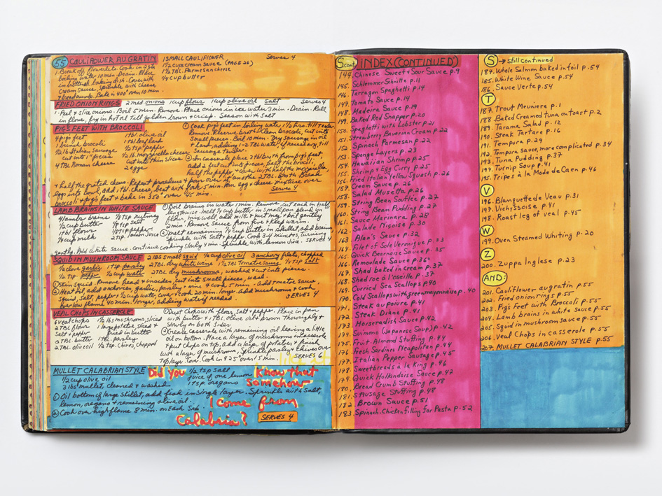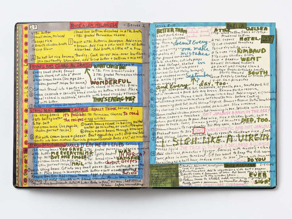 A Cookbook1969Artist book, felt pen on Bristol board, 62 pages and cover. 30 x 24 cm. Created in 1969, when she was living with Swiss artist Dieter Roth, the Cookbook is a perfect example of how she mixes daily life and an existential approach, culminating in her vision of cooking as an outlet for both eroticism and introspection. A real book of recipes full of visual delights, the Cookbook contains densely decorated pages with patterned designs, packed text, and vibrant colors. Personal sentences are interspersed among the lists of ingredients, revealing the exultations and tribulations of her life between the lines of recipes. Filled with wit and wordplay, associations between aliments and idiosyncratic thoughts—“At least one can turn pain to color” accompanies the recipe for gazpacho; “Dorothy's spirit is like this: green and yellow,” is written next to the ingredients for lentil soup—the Cookbook constitutes a mundane but essential self-portrait of the artist as a cook and a lover. |