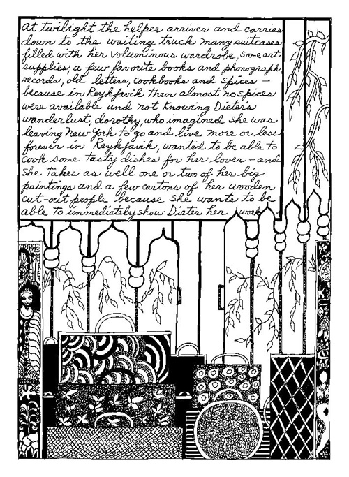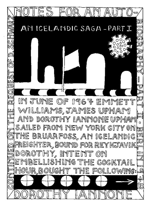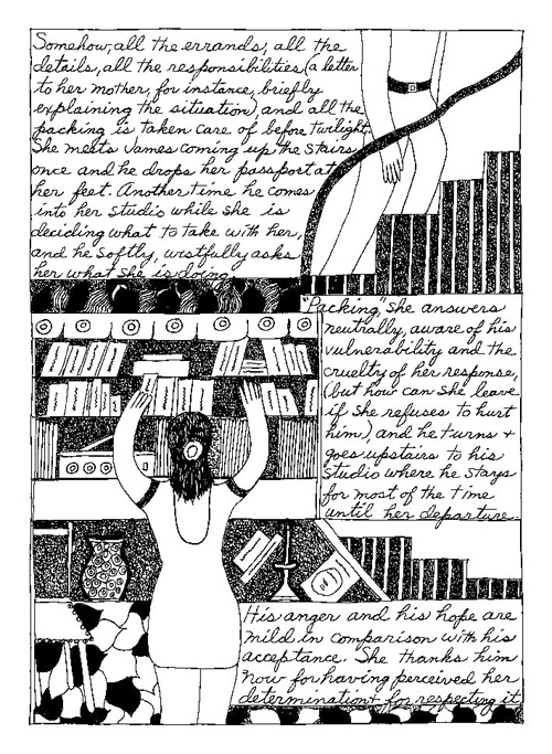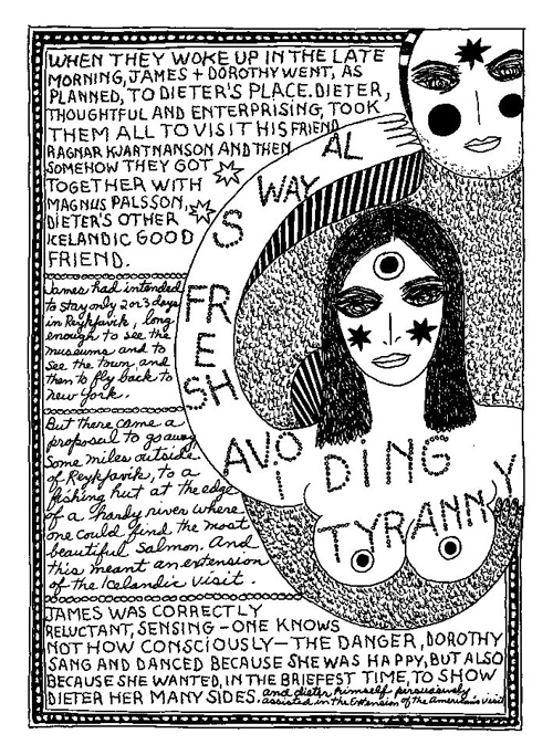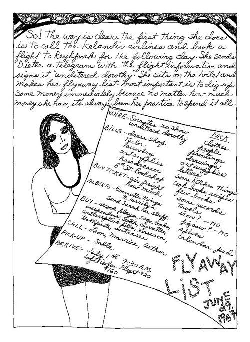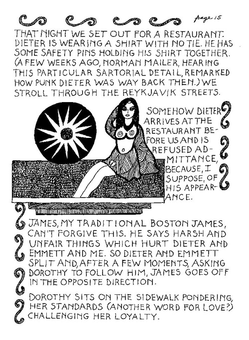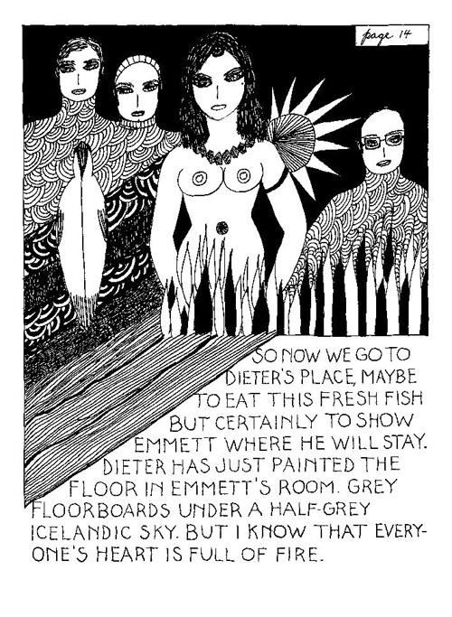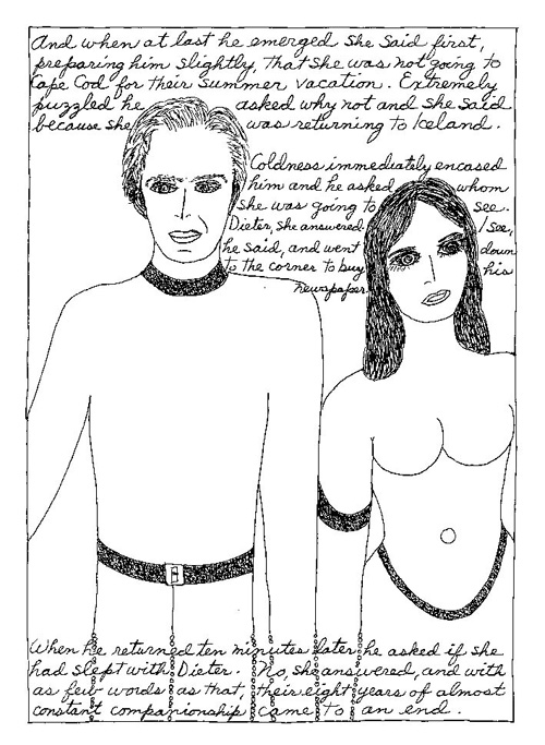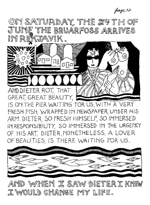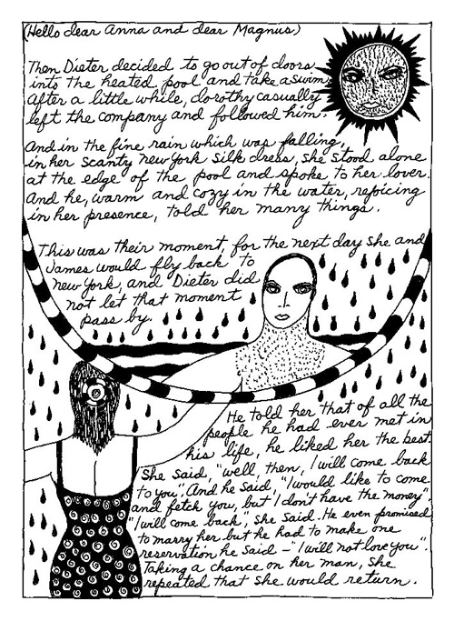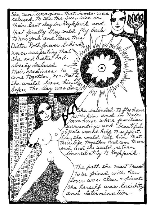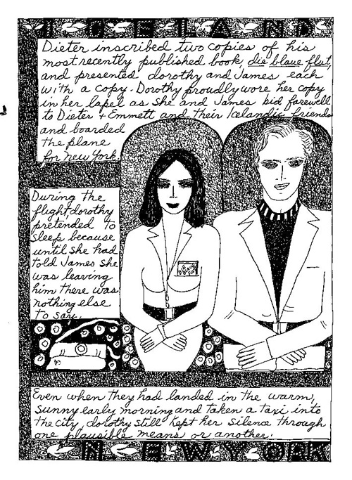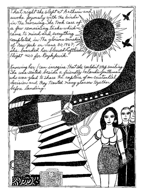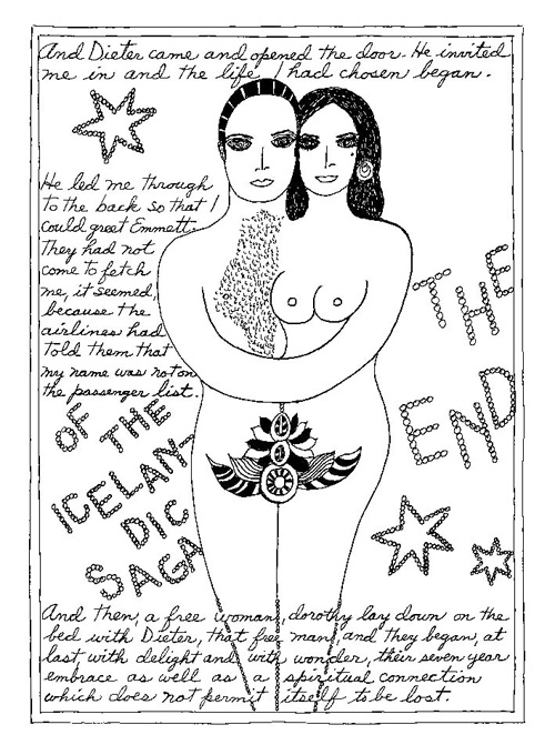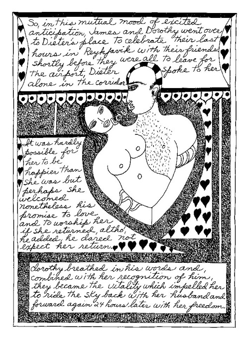 An Icelandic Saga1978, 1983, 198648 drawings, ink on Bristol board each 40 x 30 cm. In 1966, Iannone starts experimenting with artists’ books, both to expand the sphere of her narratives through the temporal effect of a page-turning (...) She develops various formats for her books, including story-sequences resembling comics (without speech bubbles) that absorbs and enhance the autobiographical impetus of her oeuvre. Books enable her to combine and juxtapose individual images, as well as to give a story its specific drive. For An Icelandic Saga, Iannone describes in 48 unpublished plates her trip to Reykjavík in 1967 as the “journey which seems to have made all other journeys possible.” It was there she met the artist Dieter Roth, with whom she swiftly fell in love and for whom she left her husband and a comfortable life in the United States. But it also marks the start of another kind of journey: Iannone’s maturation as an artist and her lifelong quest to achieve ecstatic unity, or “becoming one with another” by way of erotic love. |