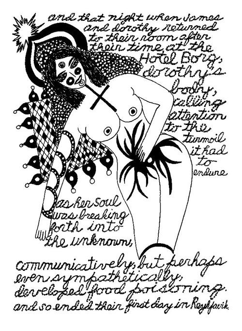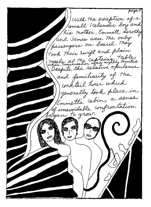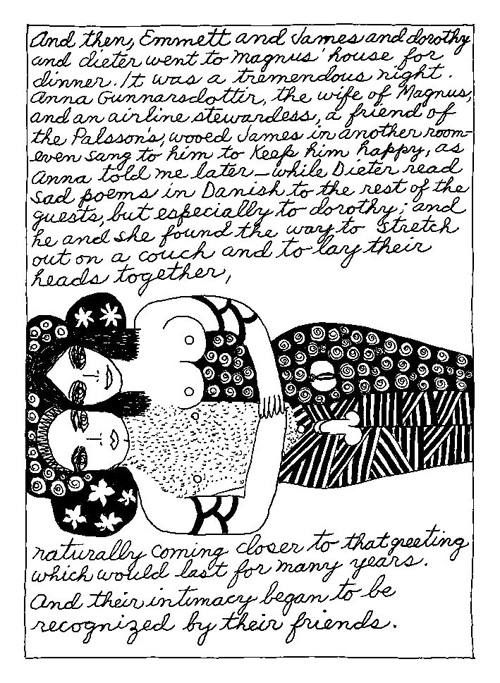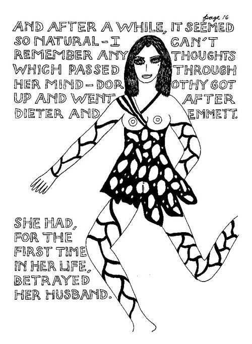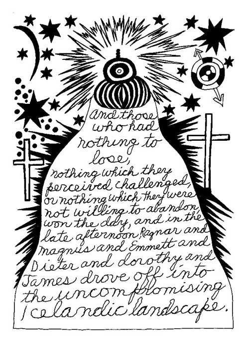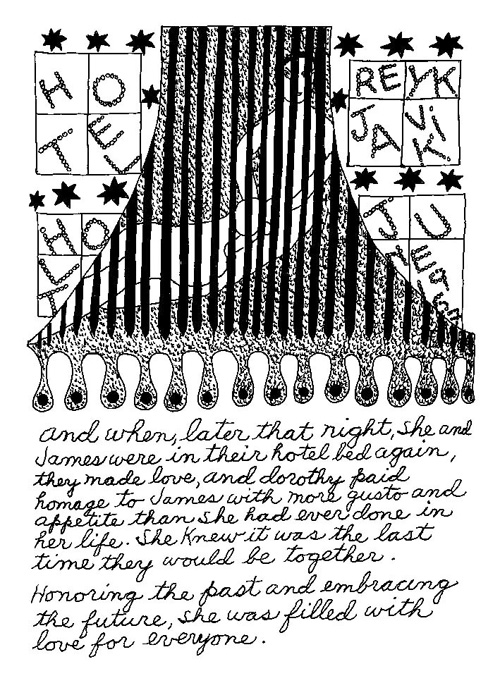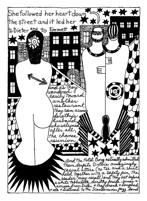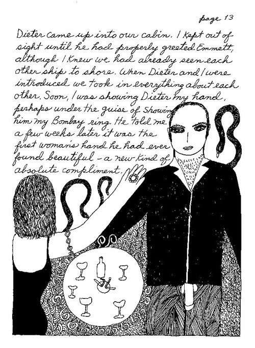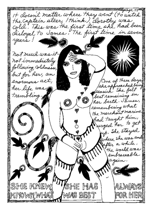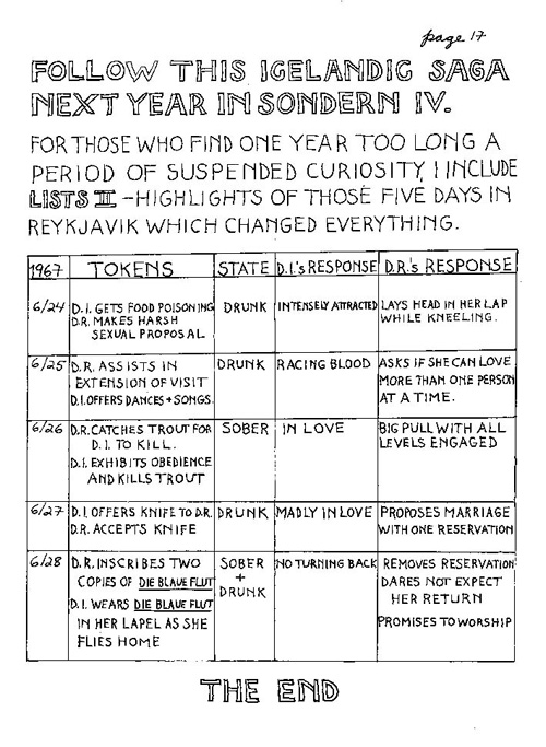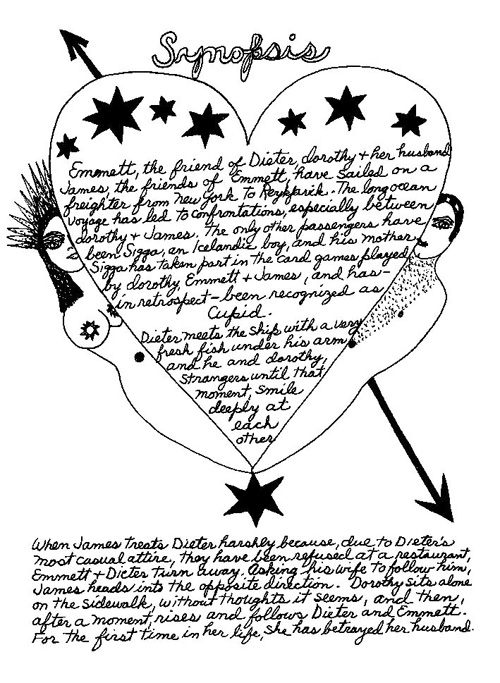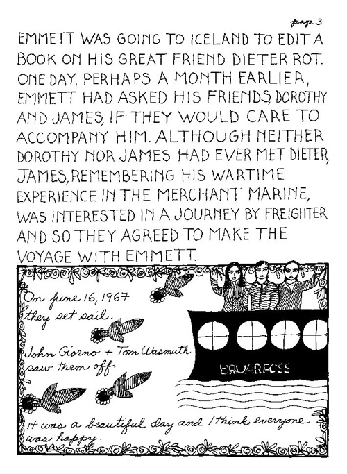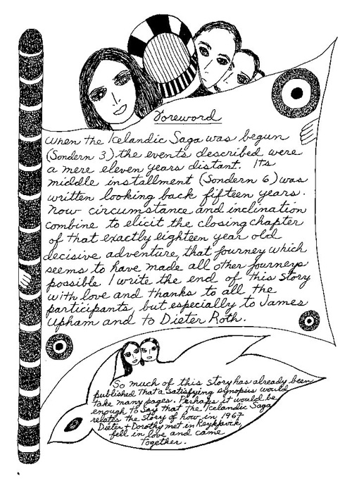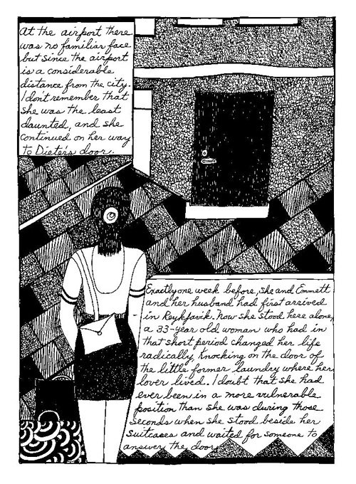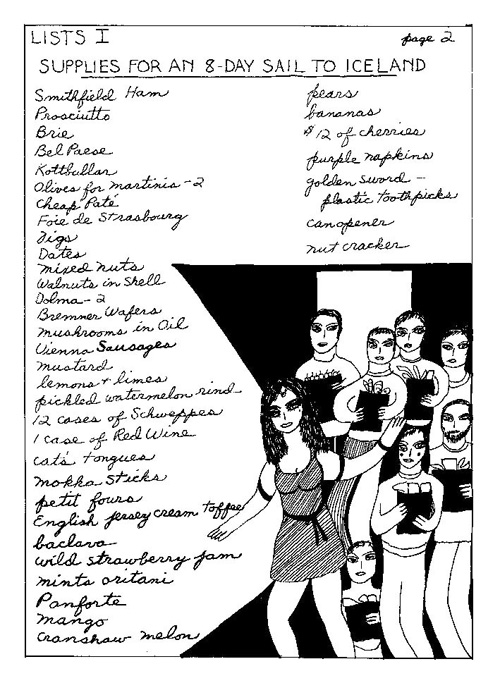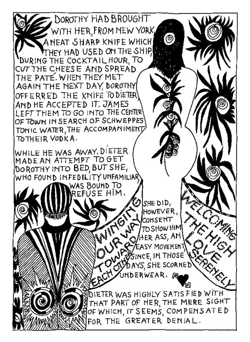 An Icelandic Saga1978, 1983, 198648 drawings, ink on Bristol board each 40 x 30 cm. In 1966, Iannone starts experimenting with artists’ books, both to expand the sphere of her narratives through the temporal effect of a page-turning (...) She develops various formats for her books, including story-sequences resembling comics (without speech bubbles) that absorbs and enhance the autobiographical impetus of her oeuvre. Books enable her to combine and juxtapose individual images, as well as to give a story its specific drive. For An Icelandic Saga, Iannone describes in 48 unpublished plates her trip to Reykjavík in 1967 as the “journey which seems to have made all other journeys possible.” It was there she met the artist Dieter Roth, with whom she swiftly fell in love and for whom she left her husband and a comfortable life in the United States. But it also marks the start of another kind of journey: Iannone’s maturation as an artist and her lifelong quest to achieve ecstatic unity, or “becoming one with another” by way of erotic love. |
