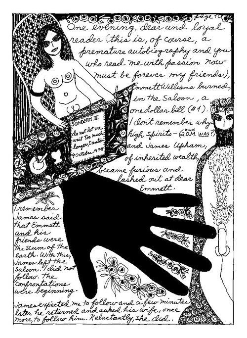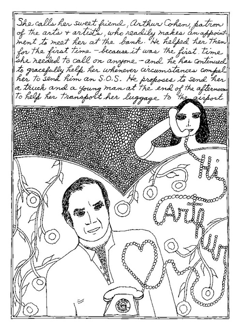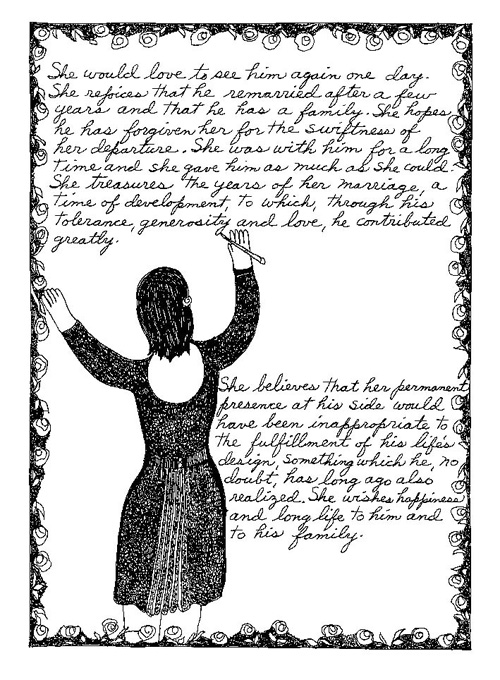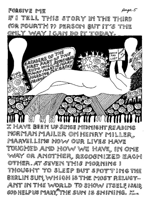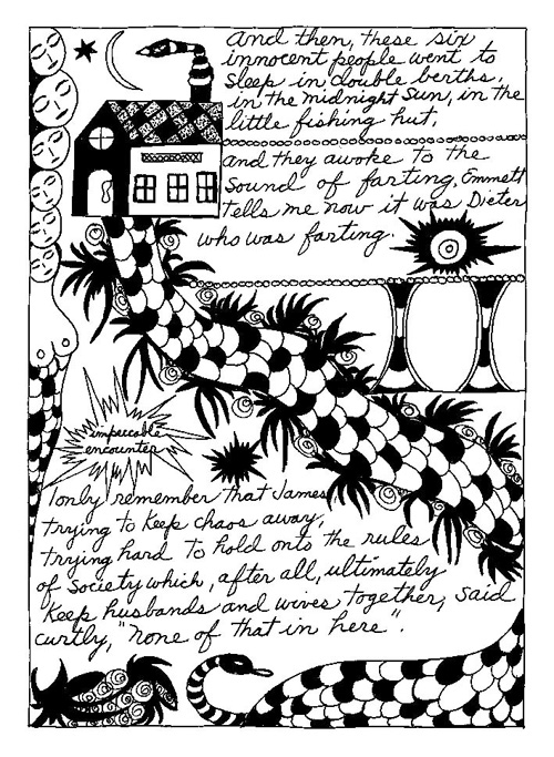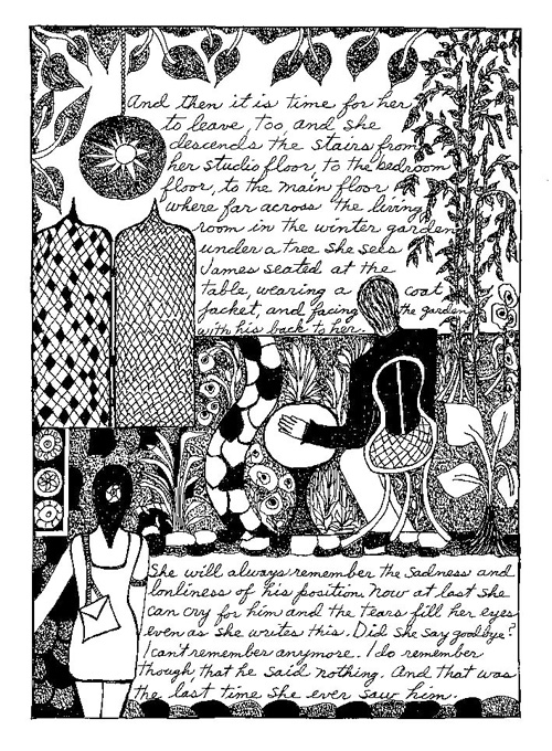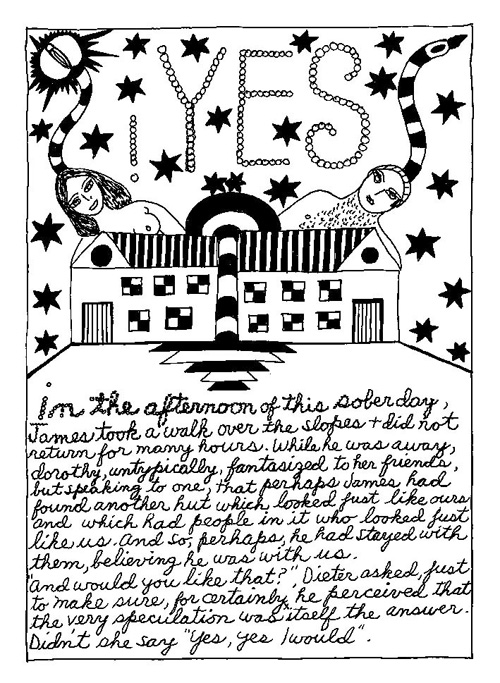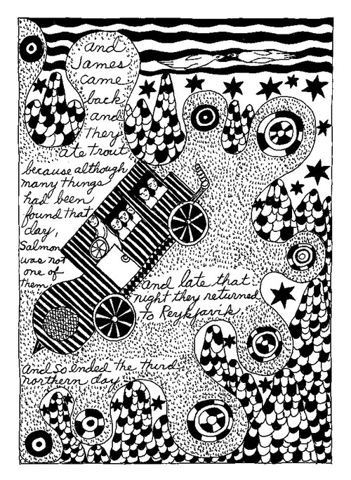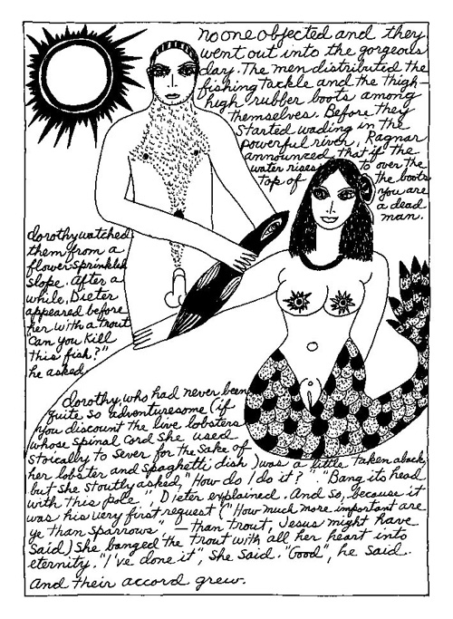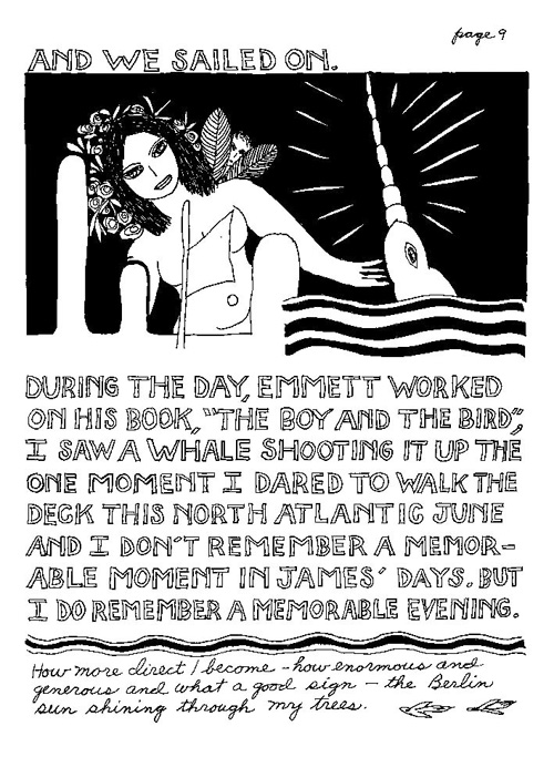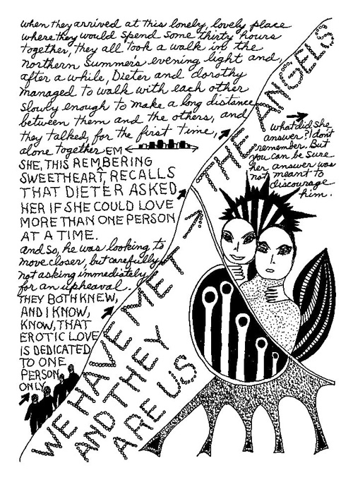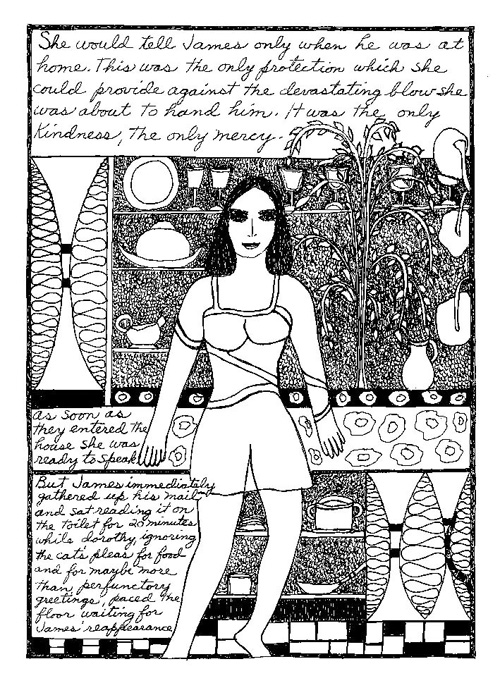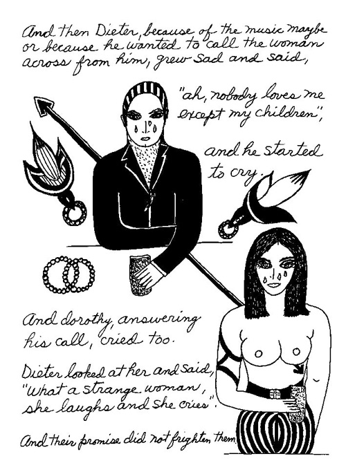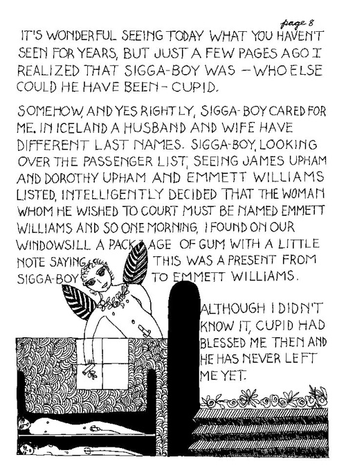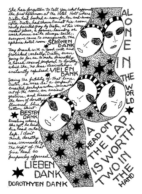 An Icelandic Saga1978, 1983, 198648 drawings, ink on Bristol board each 40 x 30 cm. In 1966, Iannone starts experimenting with artists’ books, both to expand the sphere of her narratives through the temporal effect of a page-turning (...) She develops various formats for her books, including story-sequences resembling comics (without speech bubbles) that absorbs and enhance the autobiographical impetus of her oeuvre. Books enable her to combine and juxtapose individual images, as well as to give a story its specific drive. For An Icelandic Saga, Iannone describes in 48 unpublished plates her trip to Reykjavík in 1967 as the “journey which seems to have made all other journeys possible.” It was there she met the artist Dieter Roth, with whom she swiftly fell in love and for whom she left her husband and a comfortable life in the United States. But it also marks the start of another kind of journey: Iannone’s maturation as an artist and her lifelong quest to achieve ecstatic unity, or “becoming one with another” by way of erotic love. |