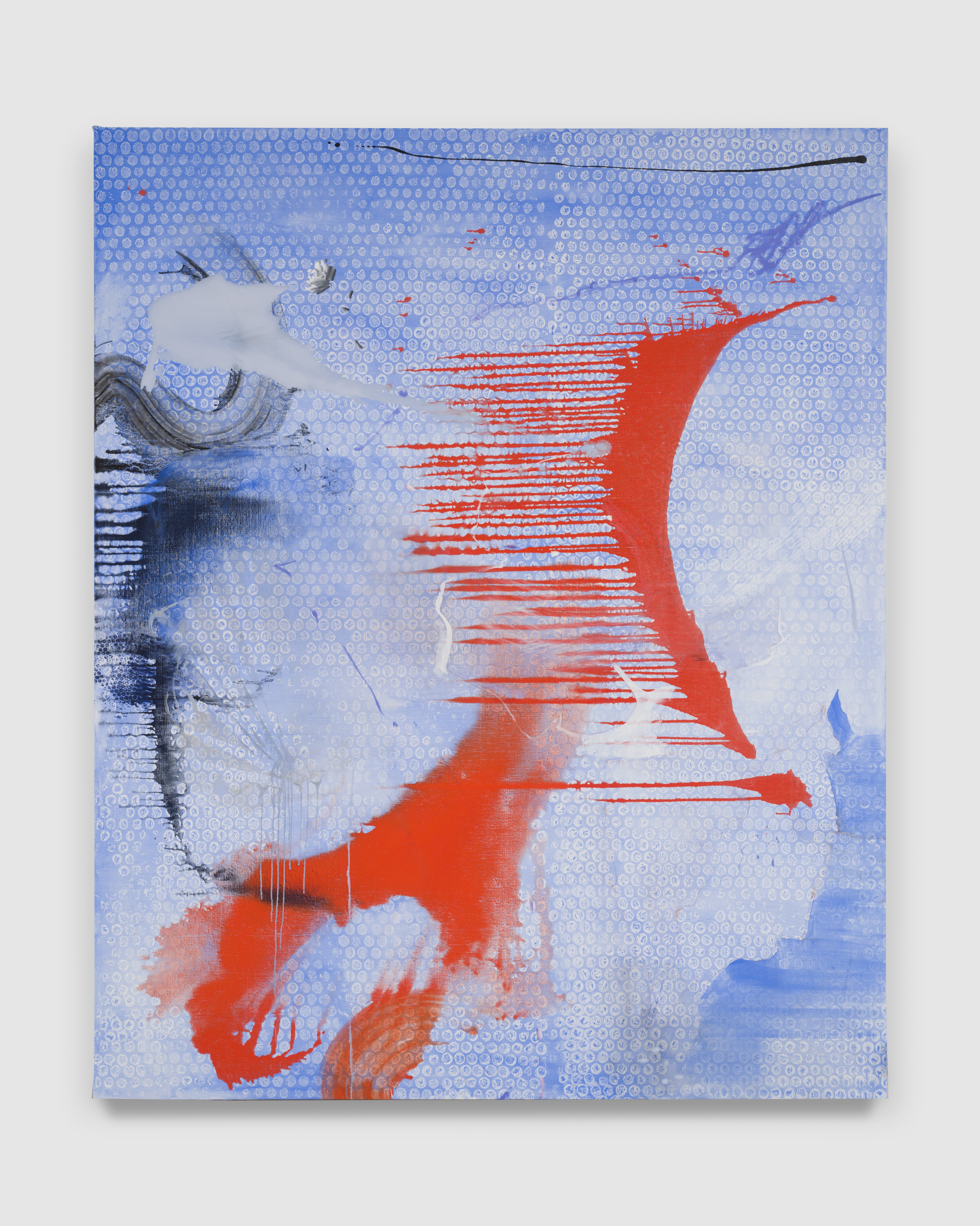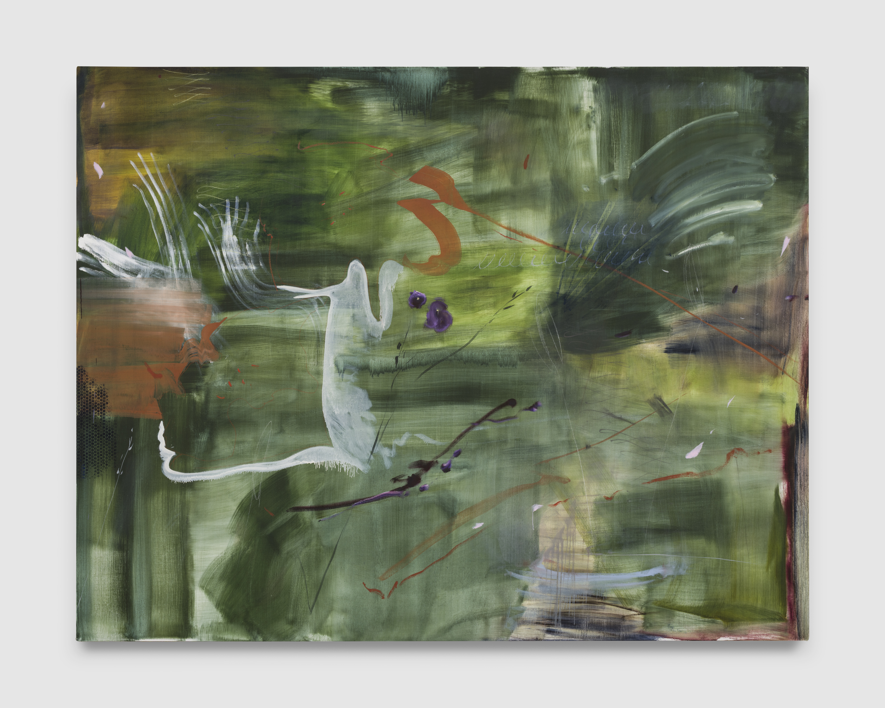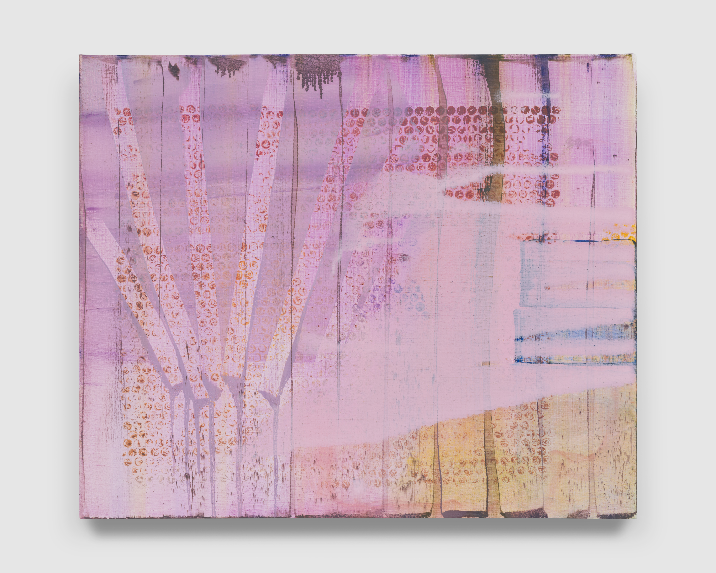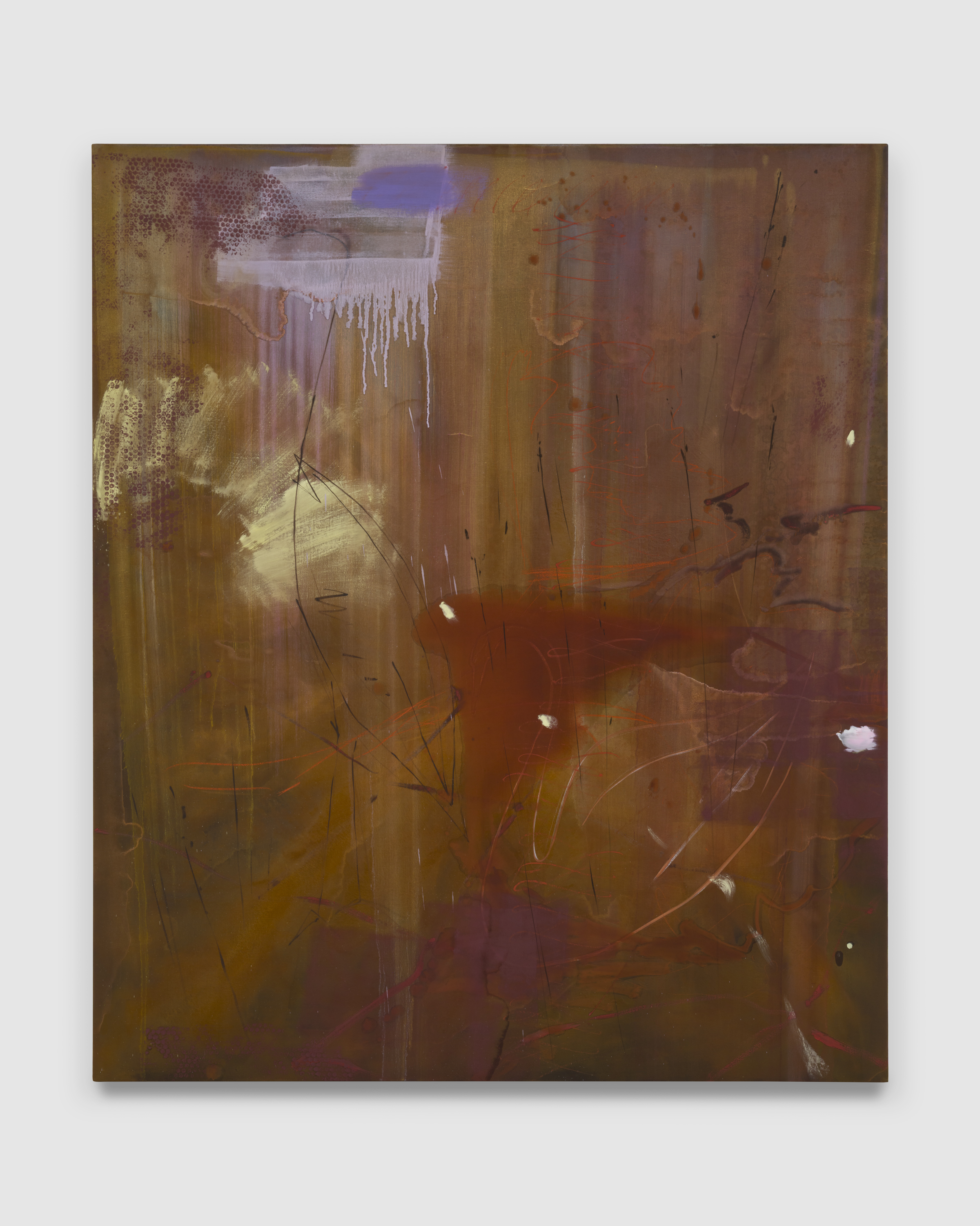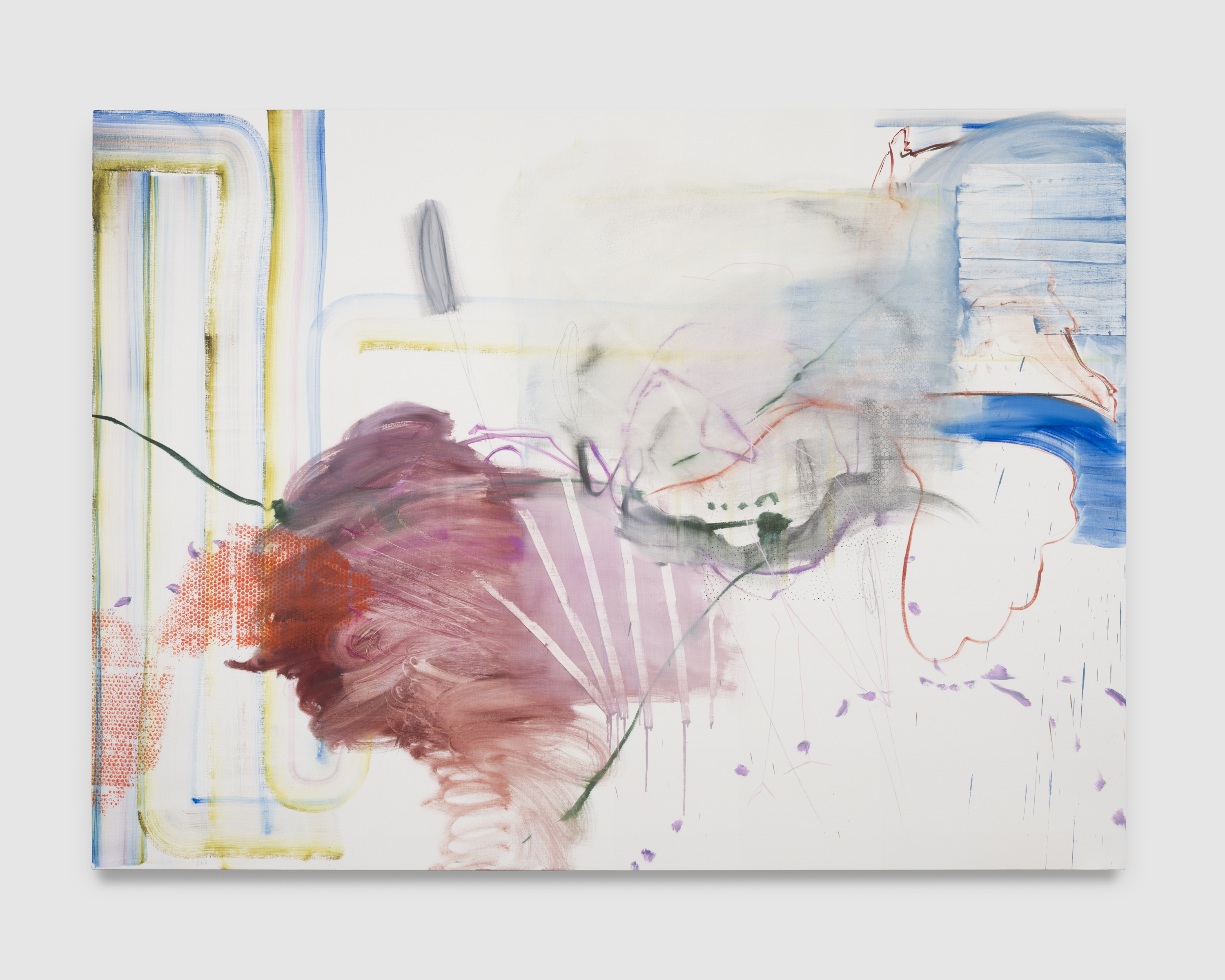 “Theater is the negation of art” [1] writes Michael Fried derisively from 1967. So be it, McIntyre and Los Angeles respond in unison from 2025, distilling and amplifying the artifice out of AbEx‘s gospel to resuscitate its corpse into a presence completely of its own time—a history-less, frontier abstraction rising up from a sun-burnt, jacaranda-tinted coastal mirage. The musty old canvas becomes a stage, populated with myriad characters, busy with action. In Los Angeles, says the poet Stephen Yenser, in place of sun-sets,