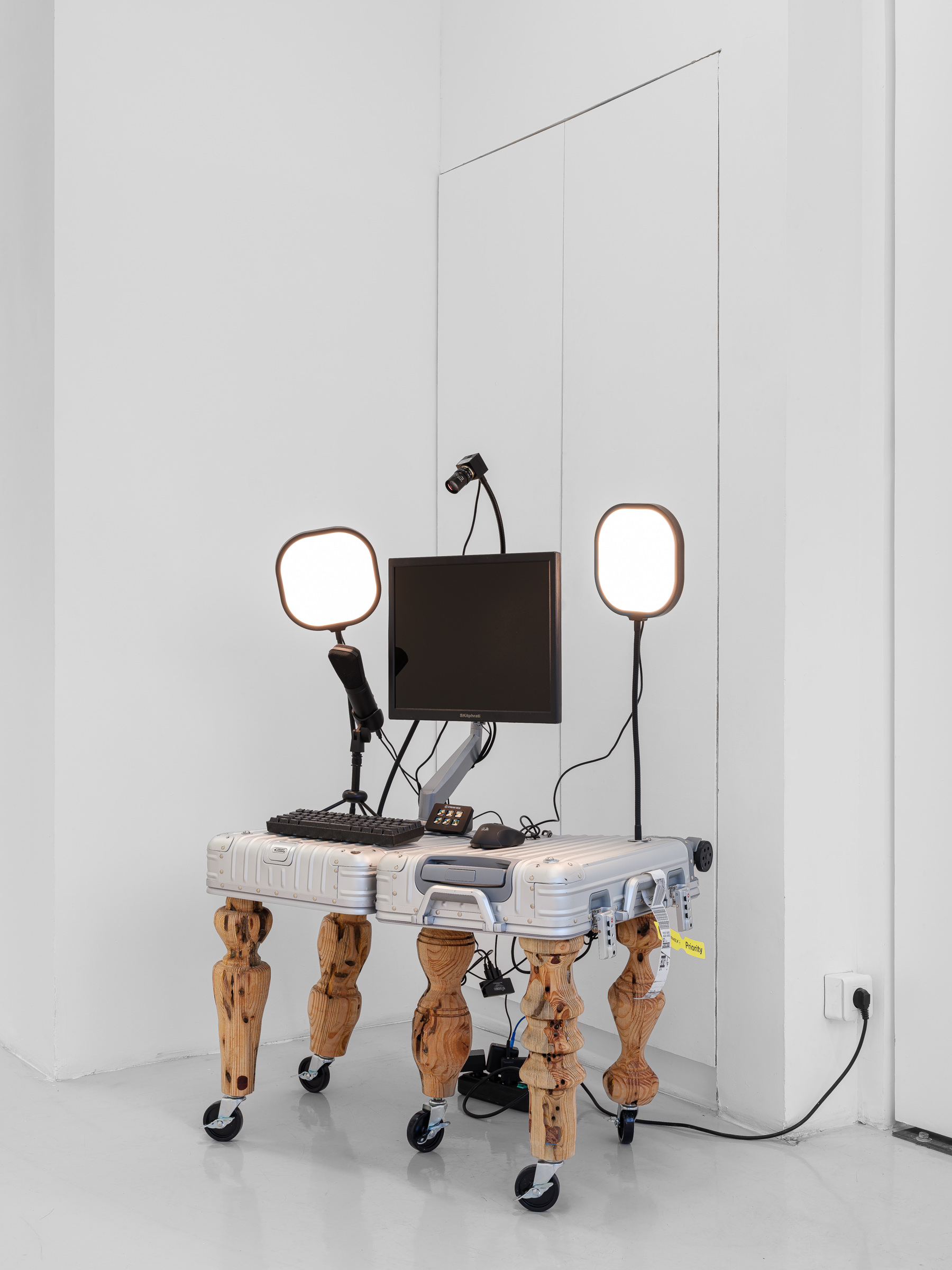 Snuggle Kit: Streaming Dock, 2025, Teredo wood, Aluminum carry-on suitcase Programmable keypad, Keyboard, Gaming mouse, Varifocal manual focus camera 5:4 monitor with stand, 2x dimmable and temperature-adjustable streaming lights, Condensor microphone, Casters, Various hardware, hubs, cables for dockin, Variable dimensions