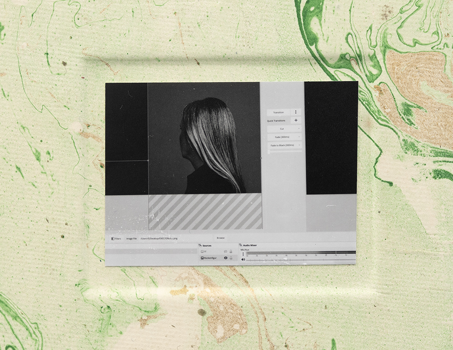 The photographs depict portraits of board executives from the online platforms Kick, Twitch, YouTube, and Spotify. Jamison imported these images into the open-source broadcasting software OBS, then produced black- and-white negatives using a custom camera, and developed the contact sheets in his darkroom.