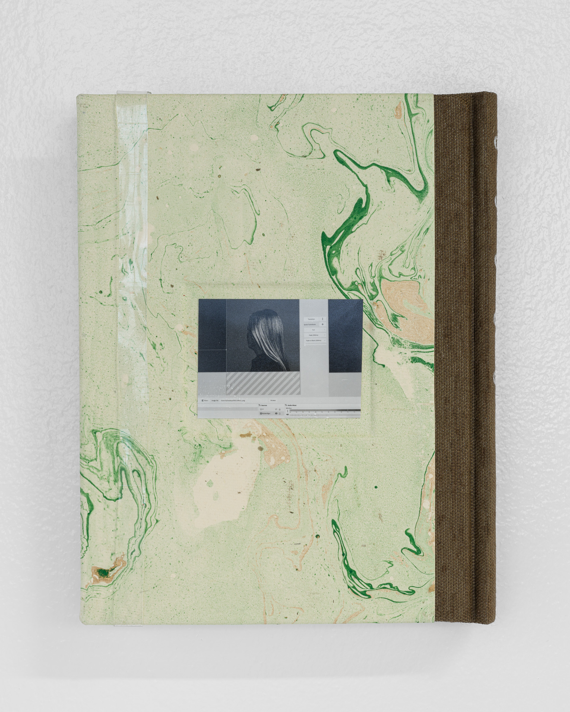 Mona Sutphen / Of Contact Prints Of Open Broadcaster Software Screen Shots Of Rückenfigur Portraits Of Streaming Services Executives Of, 2025, 80 pages, Letterpressed text and tipped in Silver Gelatin Contact Prints, Case Bound, Metal fastener and screws, 14.3 x 18.4cm. Photo: Grégory Copitet