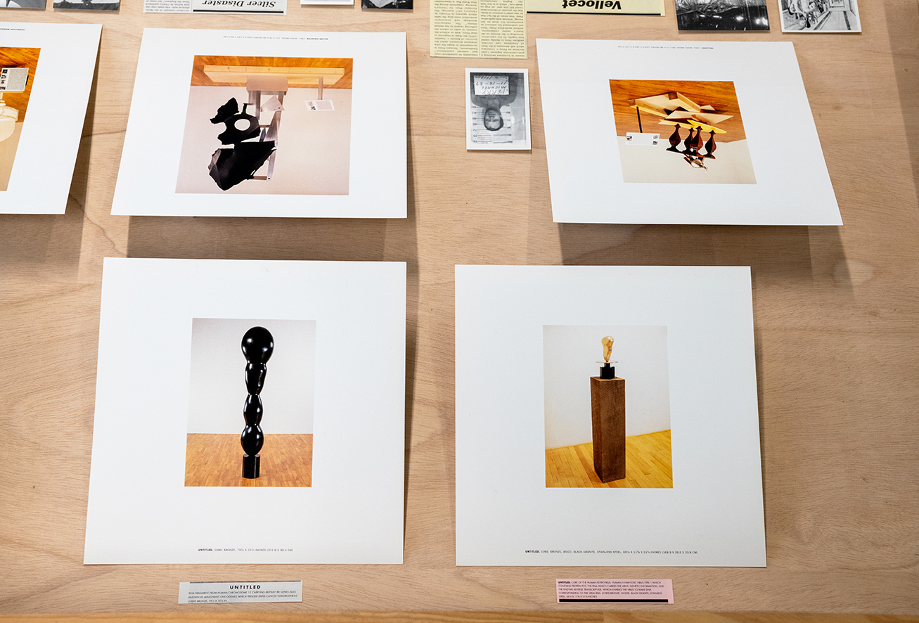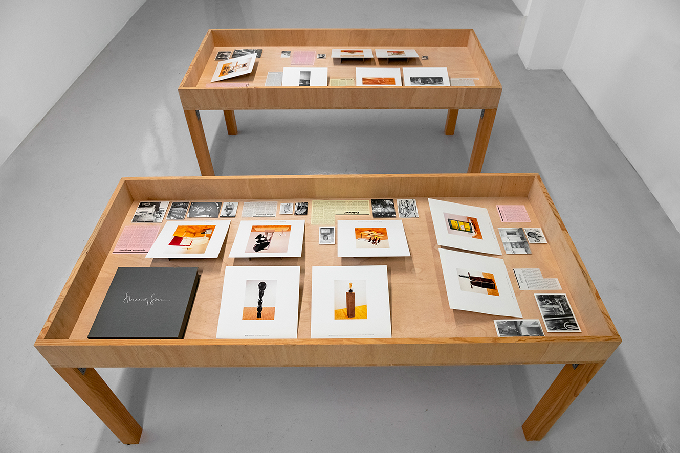 Au fond de la galerie sont présentés des dessins de ces sculptures sur le papier à en-tête
