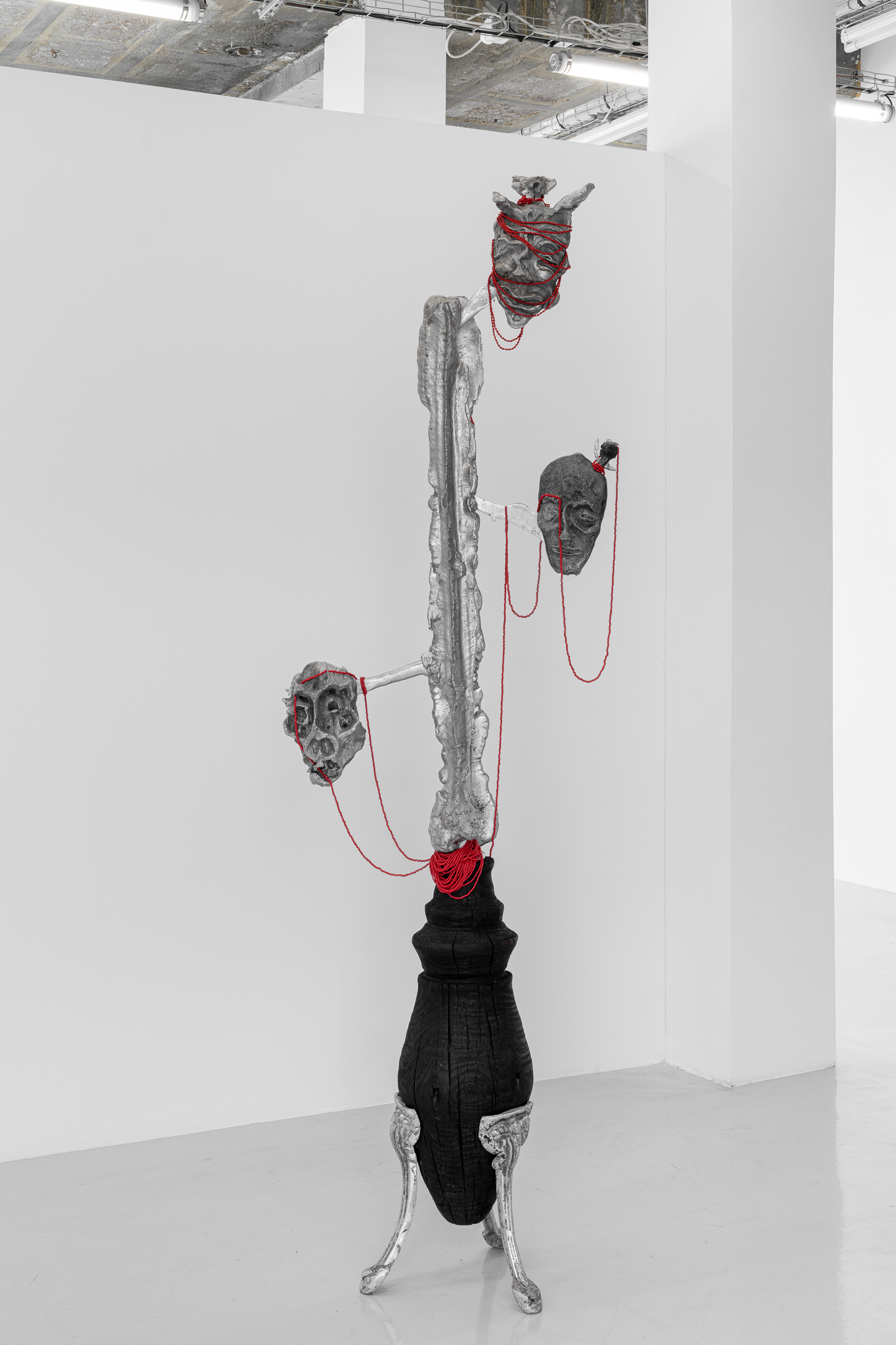 Nicolas Aguirre, Phantom columns N1, 2023-2026. Cast aluminum, wooden basin, spondylus necklaces. 200 x 50 x 50 cm. Photo : Grégory Copitet.