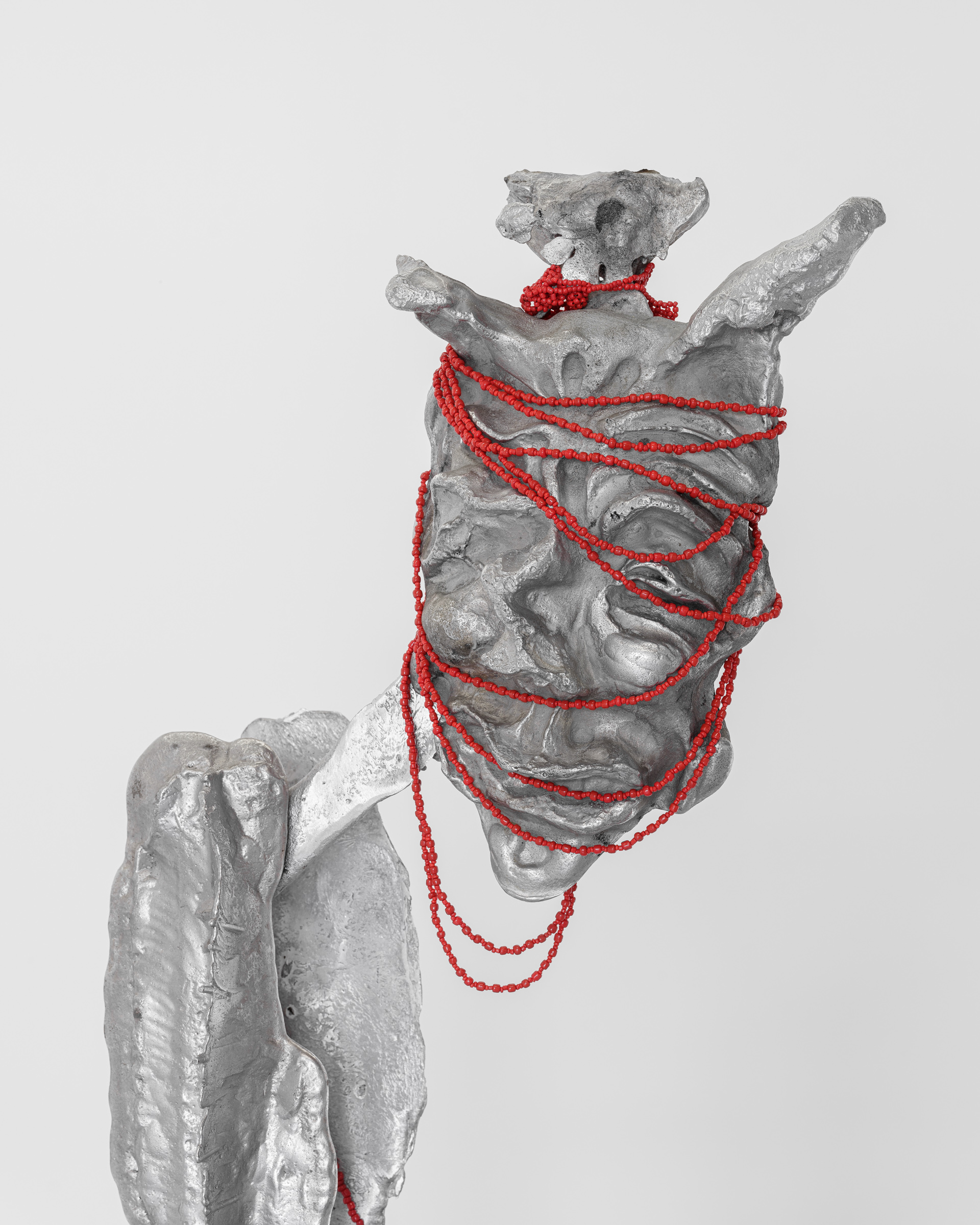 Nicolas Aguirre, Phantom columns N1 (detail), 2023-2026. Cast aluminum, wooden basin, spondylus necklaces. 200 x 50 x 50 cm. Photo : Grégory Copitet.