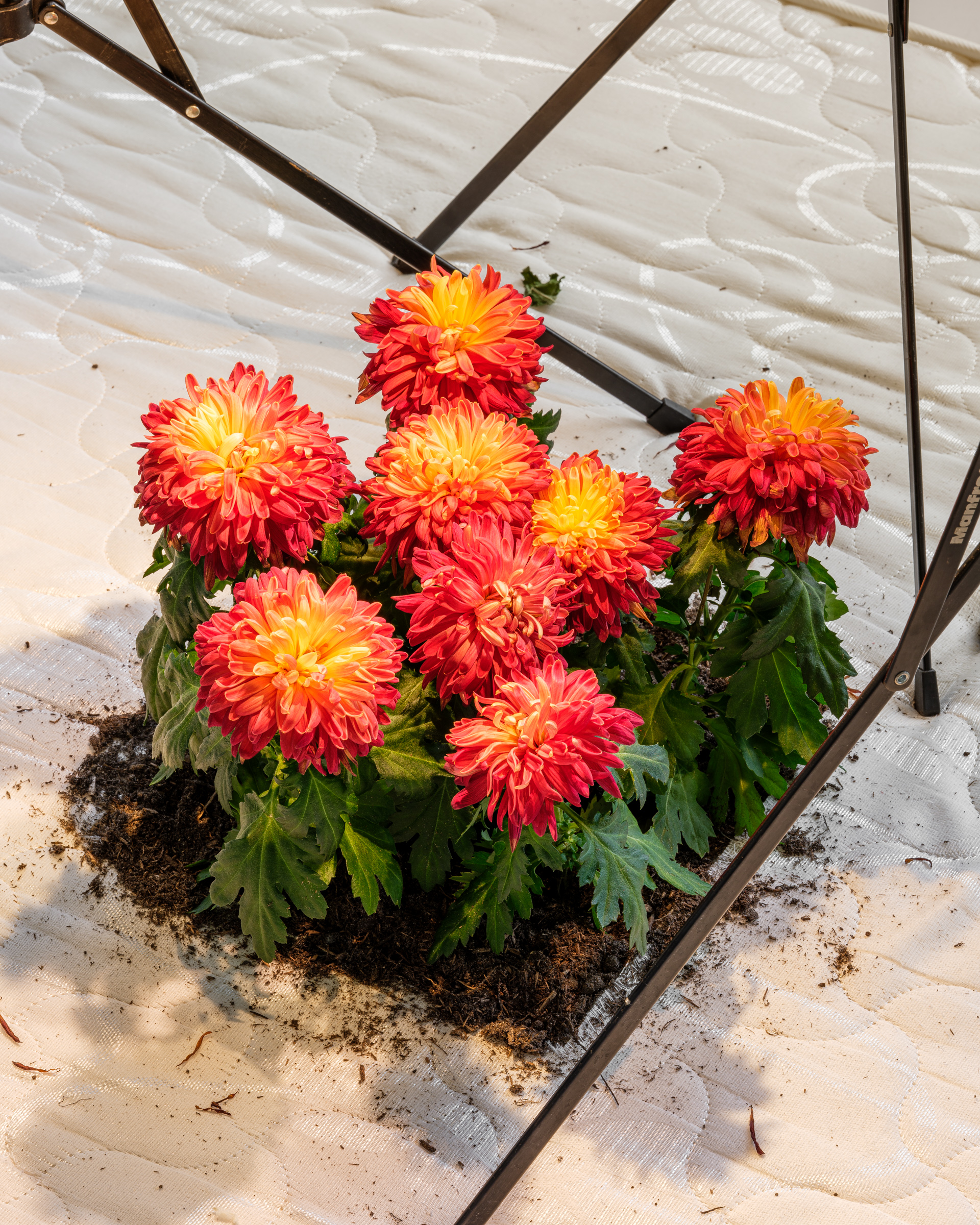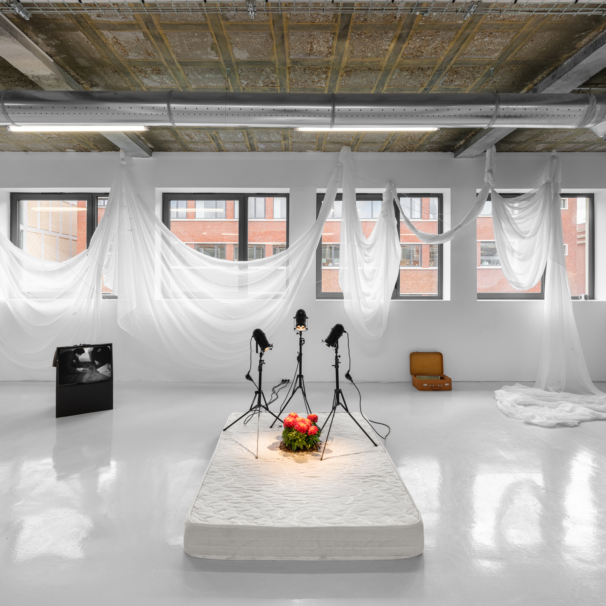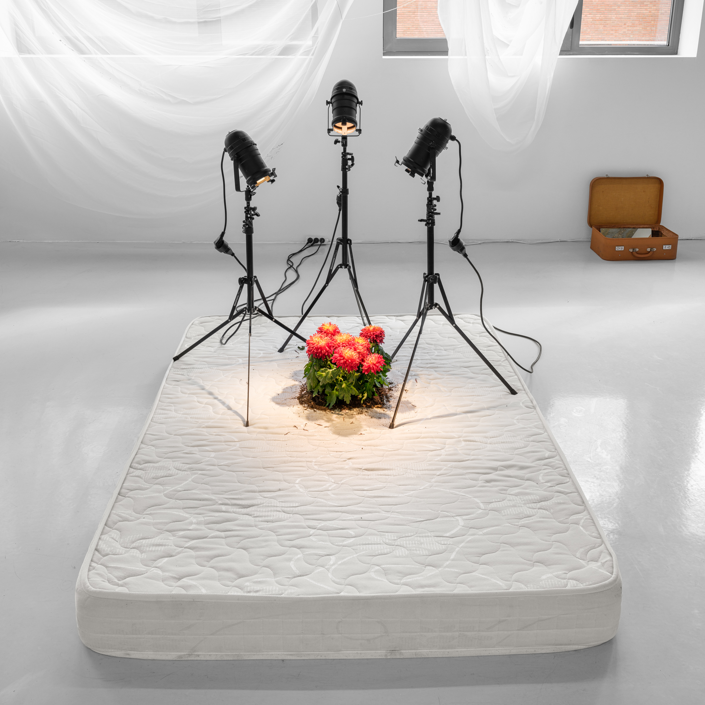 , 2020. Double mattress, bouquet of chrysanthemums, spotlights. Variable dimensions. Photo : Grégory Copitet.