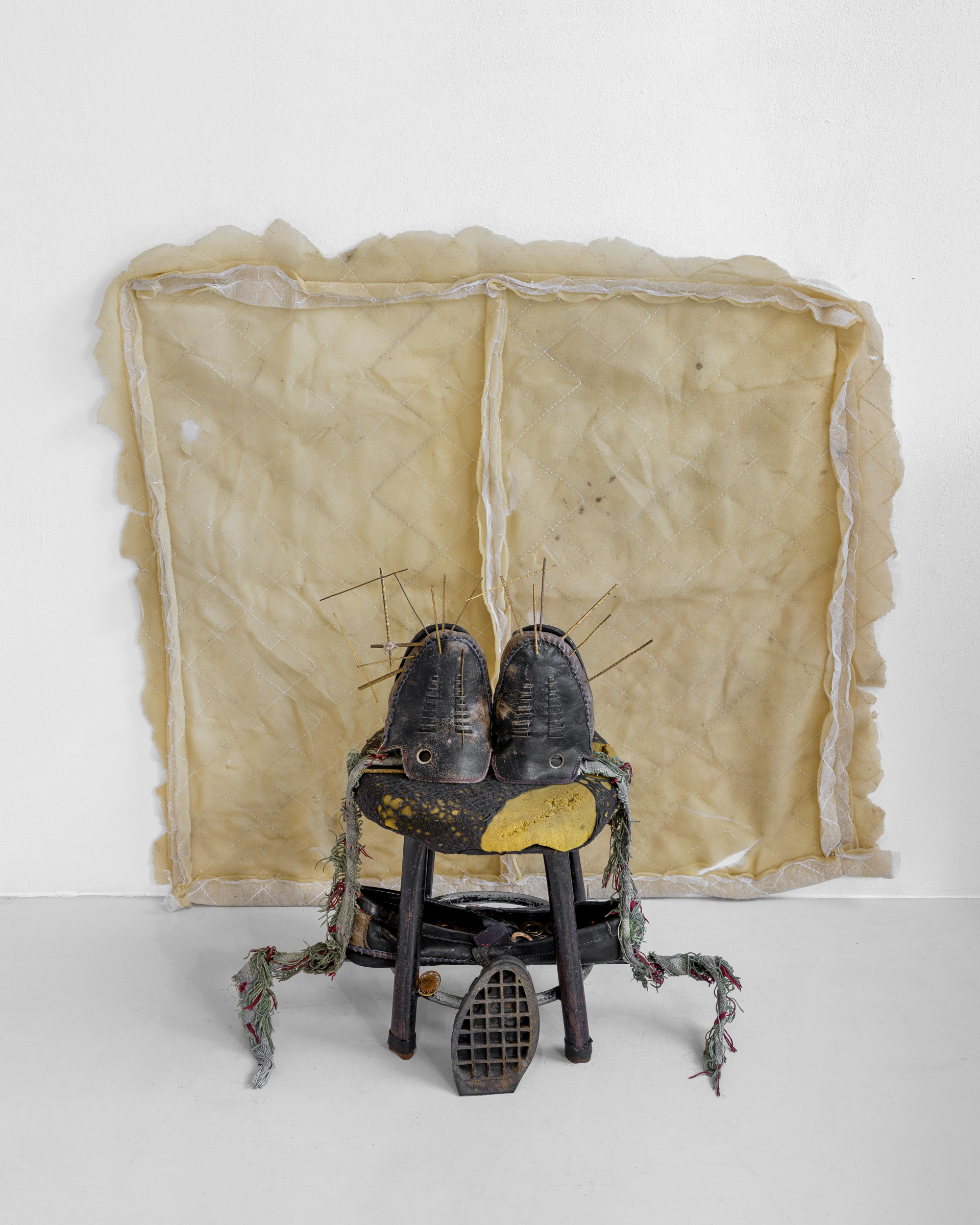 , 2024. Shoes that the artist has worn over the past two years while collecting materials from the streets, furniture ornaments from a display, fragments of Brazilian coins, a shoeshine bench, the interior of a cover, pieces of fabric. 82 x 86 x 30,5 cm. Photo : Grégory Copitet.