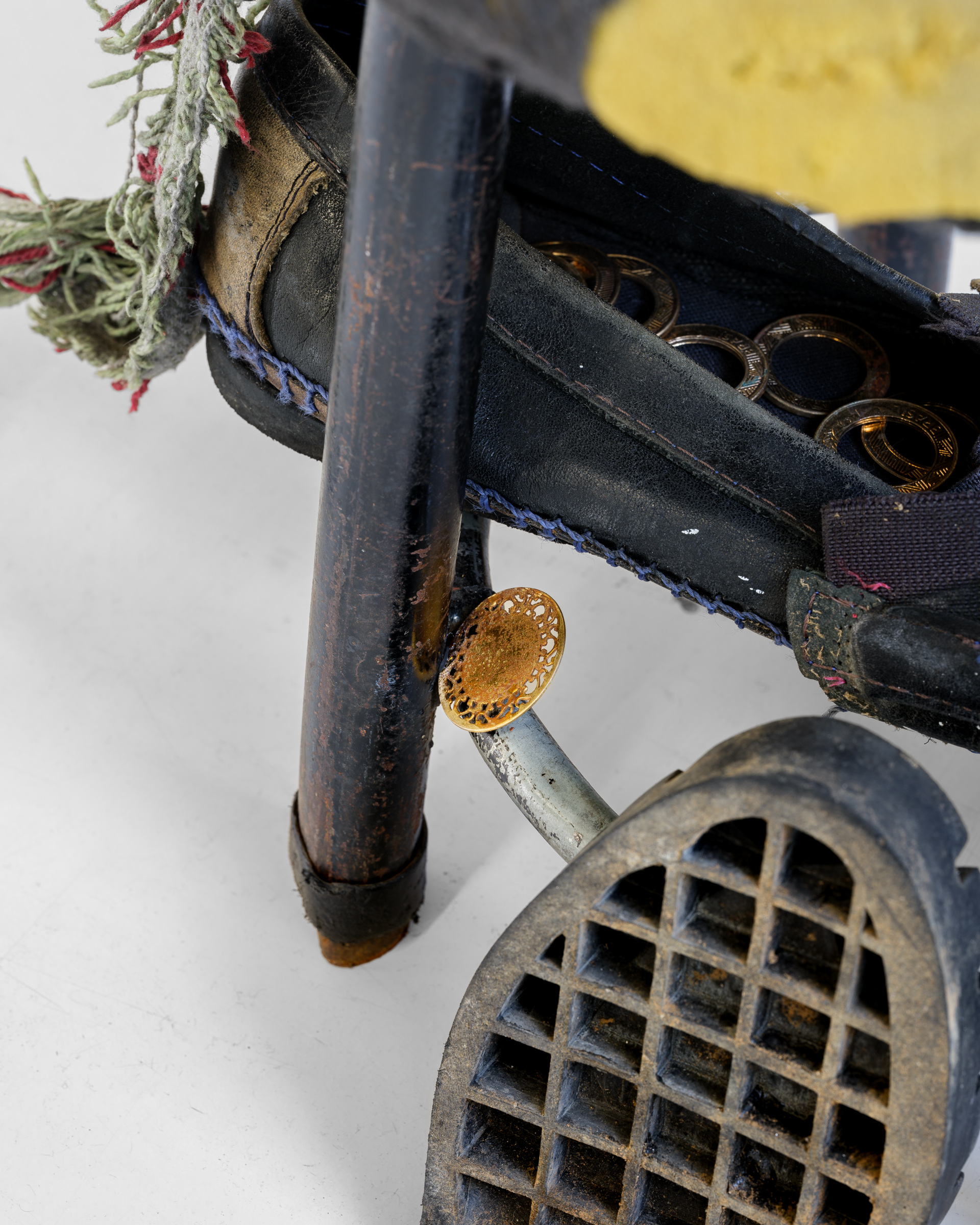 (detail), 2024. Shoes that the artist has worn over the past two years while collecting materials from the streets, furniture ornaments from a display, fragments of Brazilian coins, a shoeshine bench, the interior of a cover, pieces of fabric. 82 x 86 x 30,5 cm. Photo : Grégory Copitet.