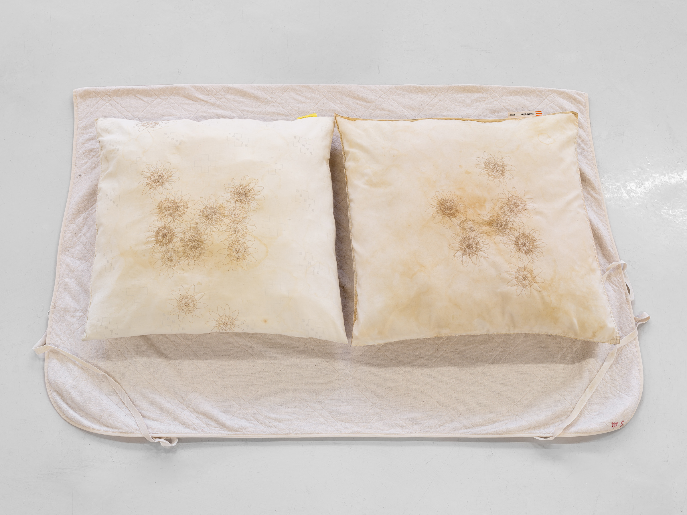 Facundo Cerain Vazquez, Vos y yo (Ritmo de Floración) , 2024. Hand embroidery on used pillows, used mattress cover. 136 x 93 x 20 cm. Photo : Grégory Copitet.