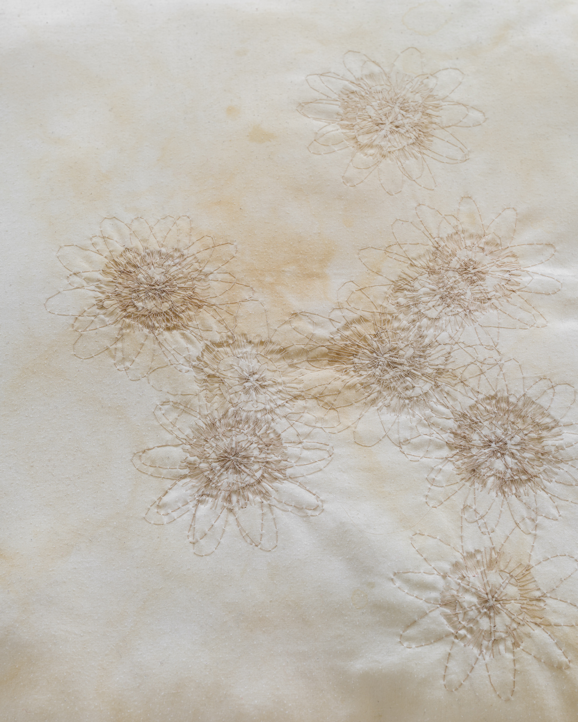 Facundo Cerain Vazquez, Vos y yo (Ritmo de Floración) (detail), 2024. Hand embroidery on used pillows, used mattress cover. 136 x 93 x 20 cm. Photo : Grégory Copitet.
