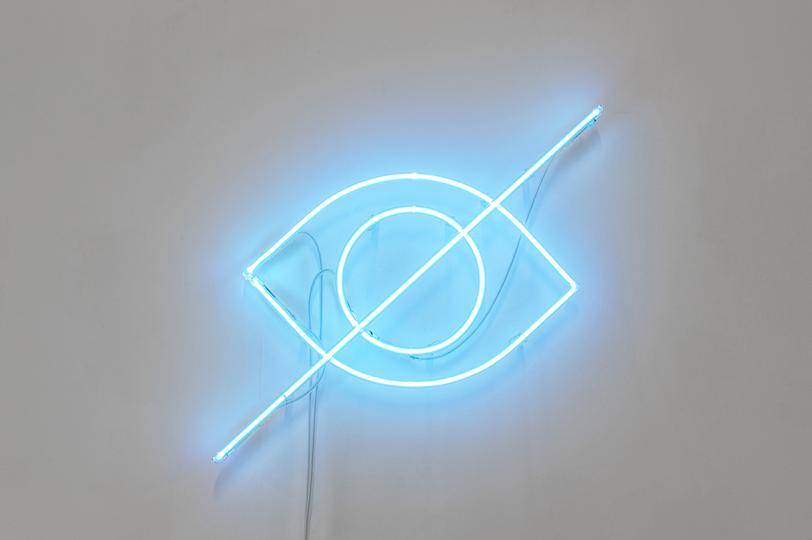 White Sight is the logo of a barred eye used as a warning on instagram, applied over images or video clips catalogued as sensitive content that appear blurred before the viewer decides to look at them. The artist has transformed it into a neon sign, mimicking the advertising aesthetics that it hijacks. It warns us that we might not see as well as we think, when it comes to our social and political reality, or even the artworks in the exhibition, that the privilege that we have to protect ourselves from sensitive contents might be the source of our blindness and that safe spaces might also make us unable to live in and fight against an unsafe world.