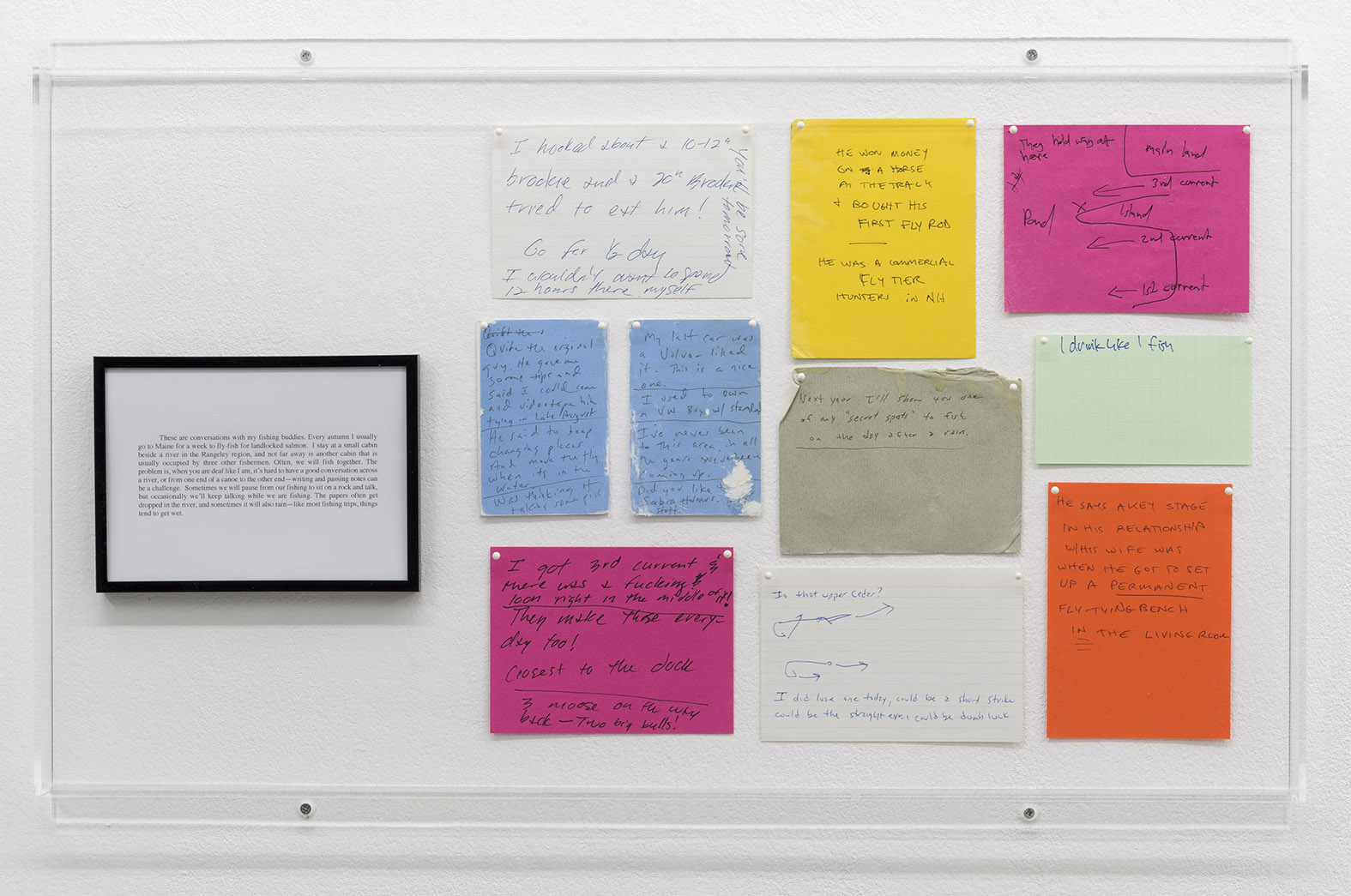 These are conversations with my fishing buddies. Every autumn I usually go to Maine for a week to fly-fish for landlocked salmon. I stay at a small cabin beside a river in the Rangeley region, and not far away is another cabin that is usually occupied by three other fishermen. Often, we will fish together. The problem is, when you are deaf like I am, it's hard to have a good conversation across a river, or from one end of a canoe to the other hand - writting and passing notes can be a challenge. Sometimes wewill pause from our fishing to sit on a rock and talk, but occasionally we'll keep talking while we are fishing. The papers often get dropped in the river, and somethimes it will also rain - like most fishing trips, things tend to get wet.
