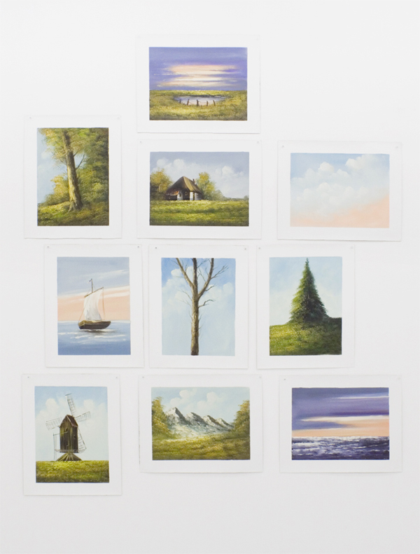 The activities of Martin Douven (1898-1973), a self-taught artist from Limburg, provide the starting point of the Jef Geys interest for production-line painting, for authenticity in art and for the creative process a work of art goes through. The man began selling his own paintings in 1928 in furniture shops. As soon has his nine children were old enough, he got them painting also. In analogy to the method of the “industrial production chain” each child/family member took care of a part of the canvas (blue sky, cloud, tree…), and the father would take care of the finishing touch . In the 1950s the family Douven went to live in Leopoldsburg, where Jef Geys lived in those years. He became friend with François, one of the Douven children, and often visited the factory in full productivity nearby.